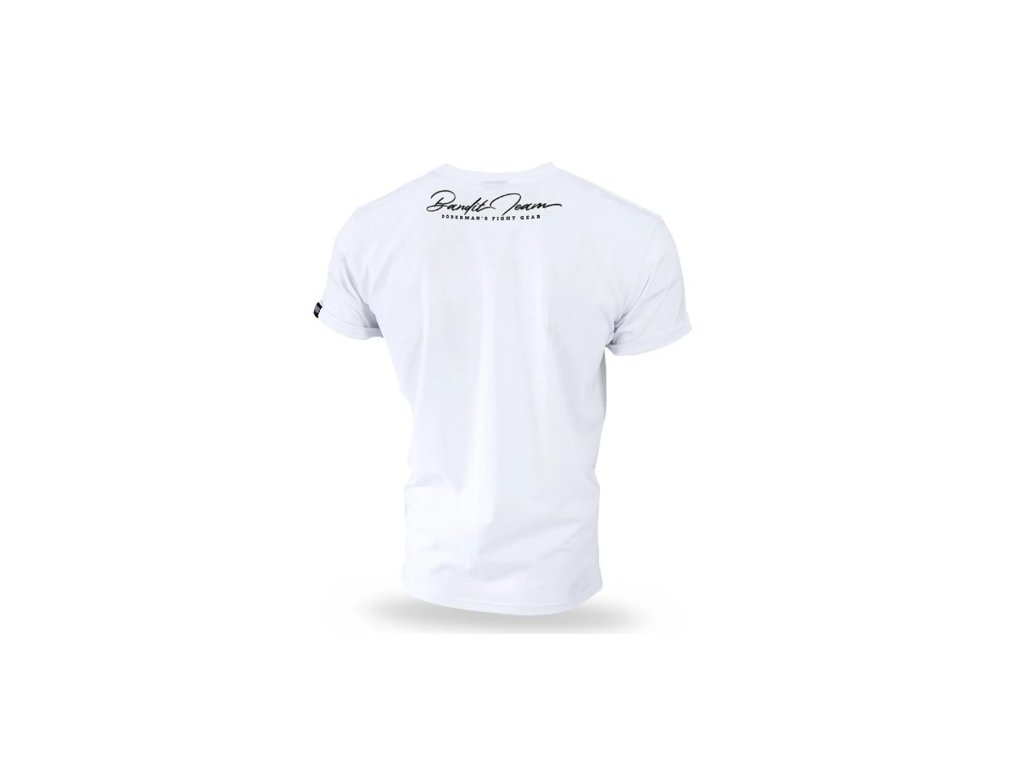 Uprostřed vzoru nápis Bandit Combat Gear of 2018. Použité gotické písmo a efekt popraskání potisku. Na krku heslo Bandit Team Doberman's Fight Gear. Standardní pánský střih trička s krátkým rukávem a stahovacím lemem u krku.