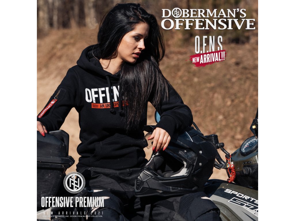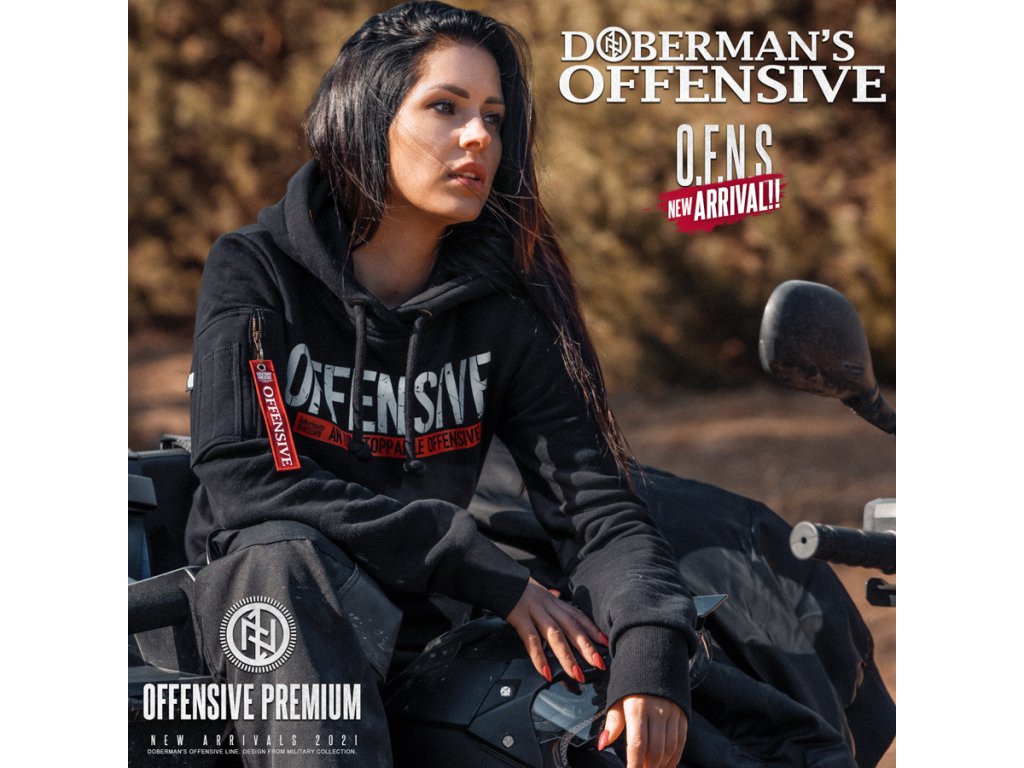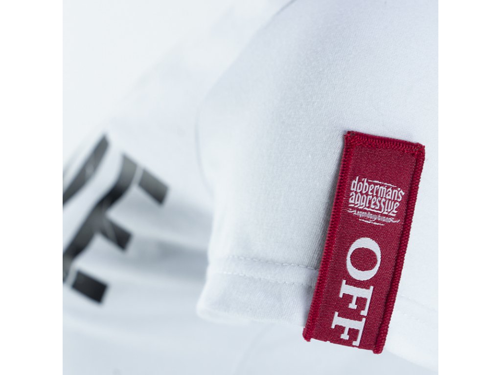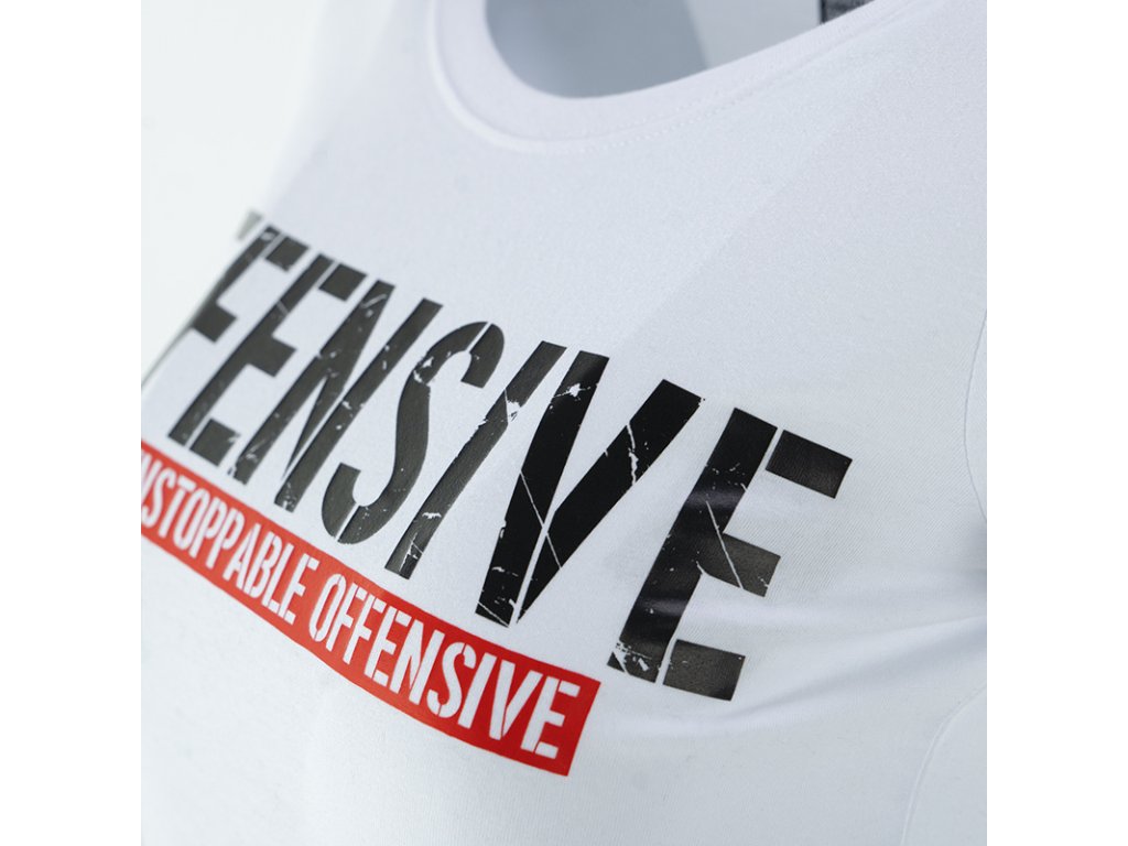 Na levém rukávu je všitá velká červená cedulka s nápisem Offensive. Tričko zdobí jednoduchý stylem, ale velice charakteristický velký potisk - OFFENSIVE, pod kterým se nachází ještě menší nápis na červeném pozadí An Unstoppable Offensive.