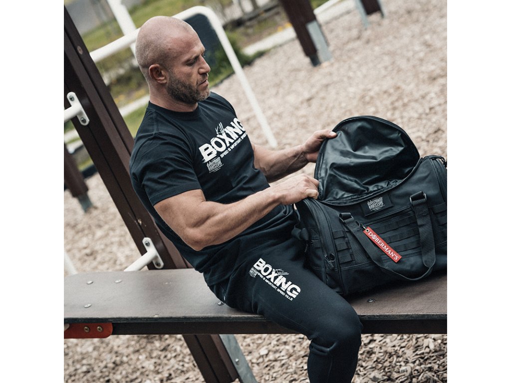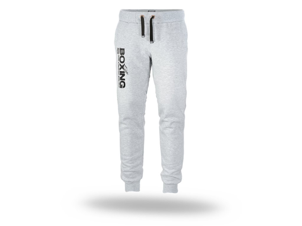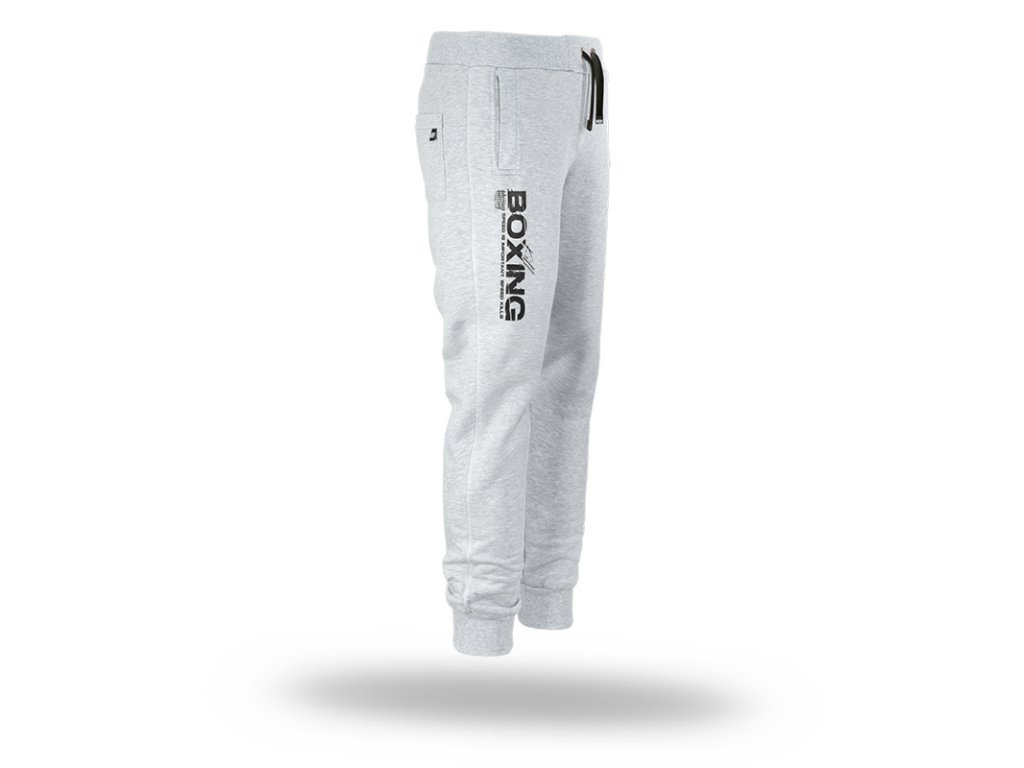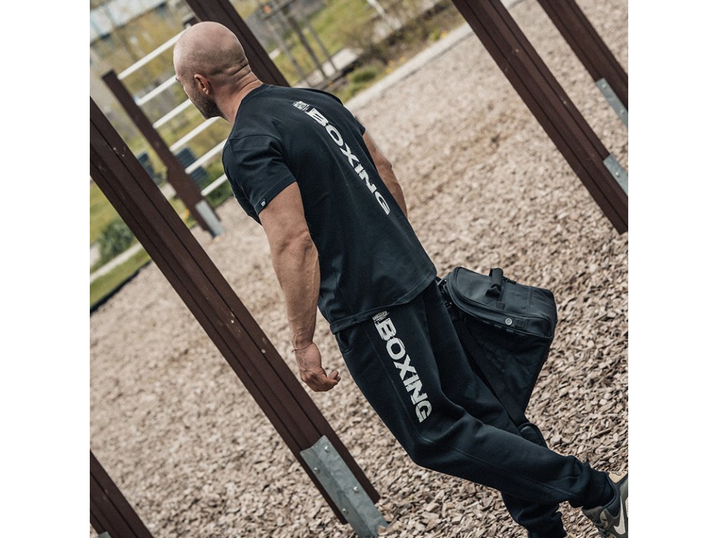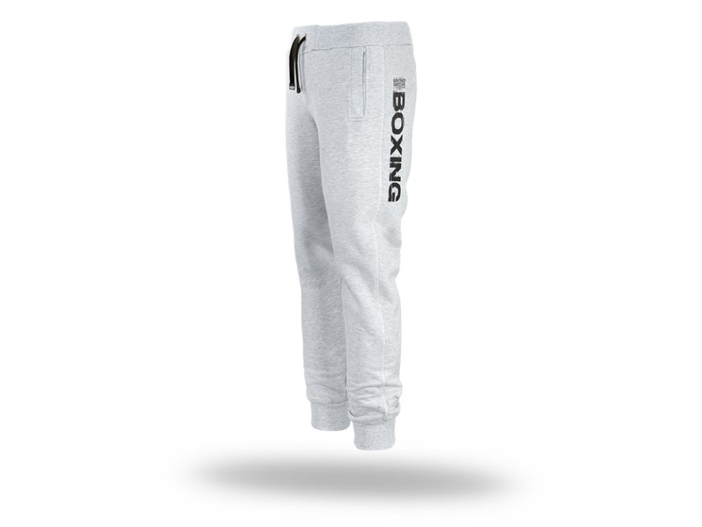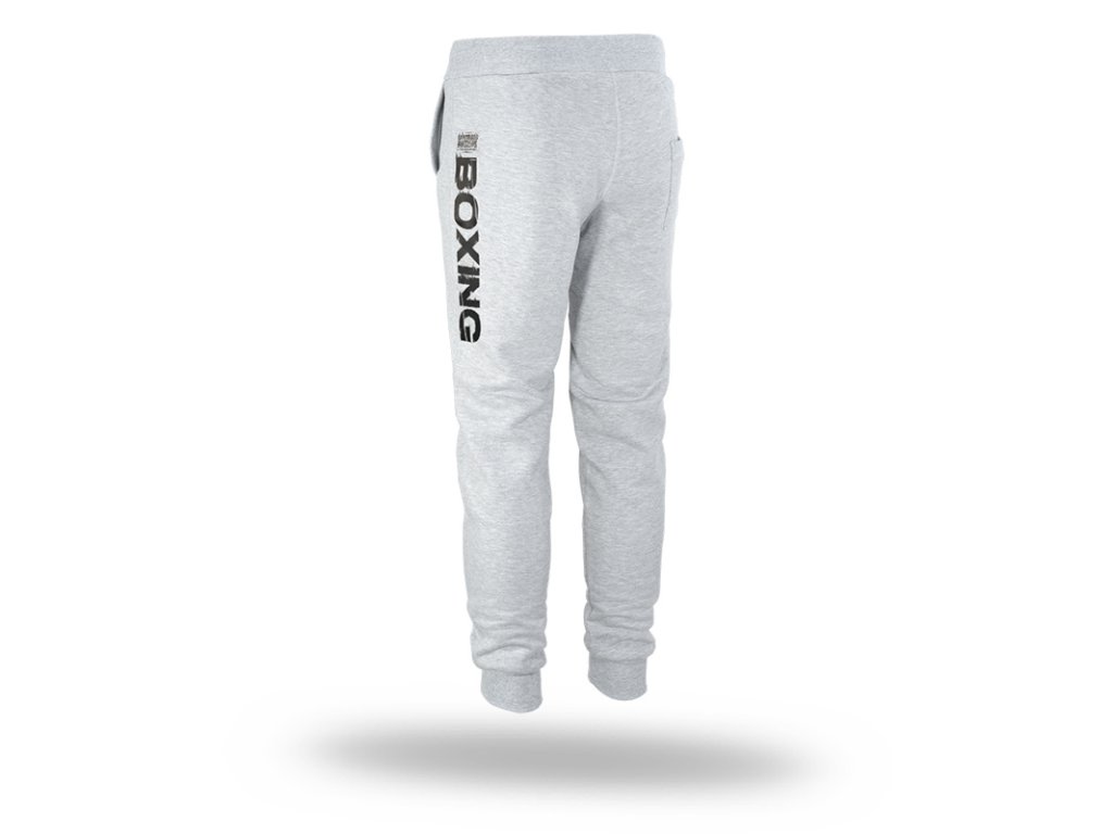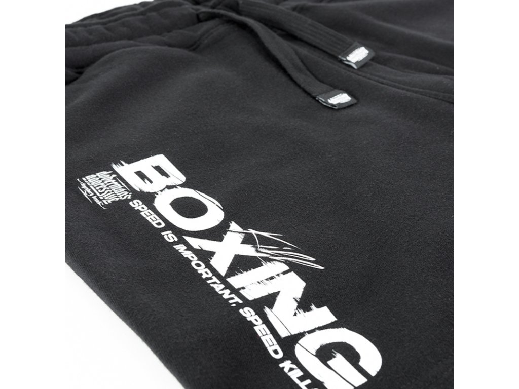 V pase mají elastický stahovací lem a šňůrky. Na přední straně nohavice je jednobarevný potisk s nápisem BOXING a logem značky, umístěným pod kapsou. Na zadní straně levé nohavice je také nápis Boxing s logem značky.