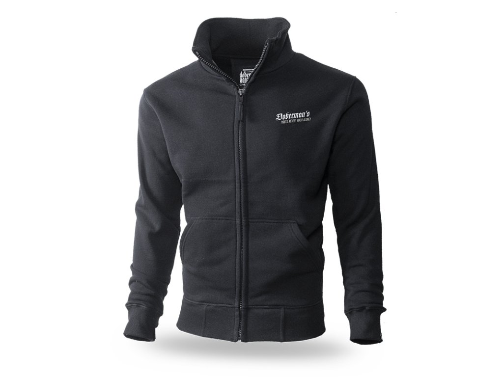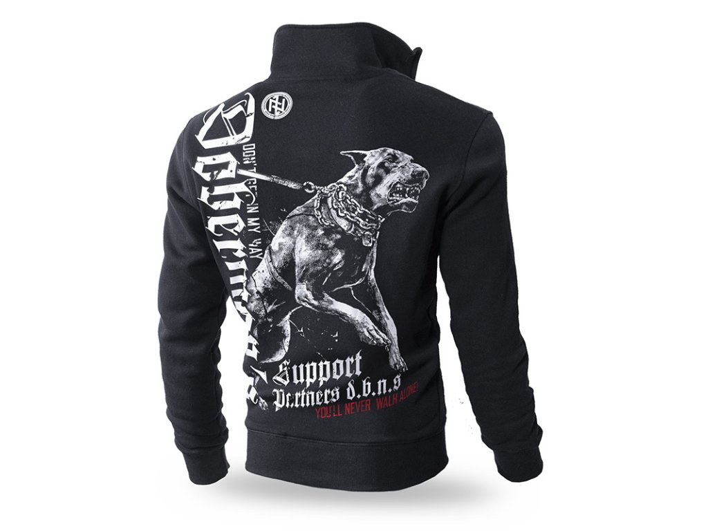 Zvýšený límec skvěle chrání krk. Dolní část mikiny a rukávů je zakončená širokými, odolnými stahovacími lemy. Oblečení je vyrobeno z bavlny o vysoké hmotnosti (320). Na levém rukávu je našitá malá cedulka s logem značky. Levá strana hrudi je zdobená nápisem Dobermans. Na zádech je velký potisk s obrazem agresivního psa na vodítku. Níže je nápis Support Partnes, a vedle Dobermans. U celého vzoru je použitý efekt poničení.