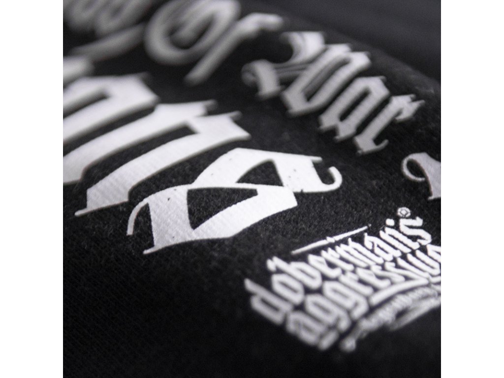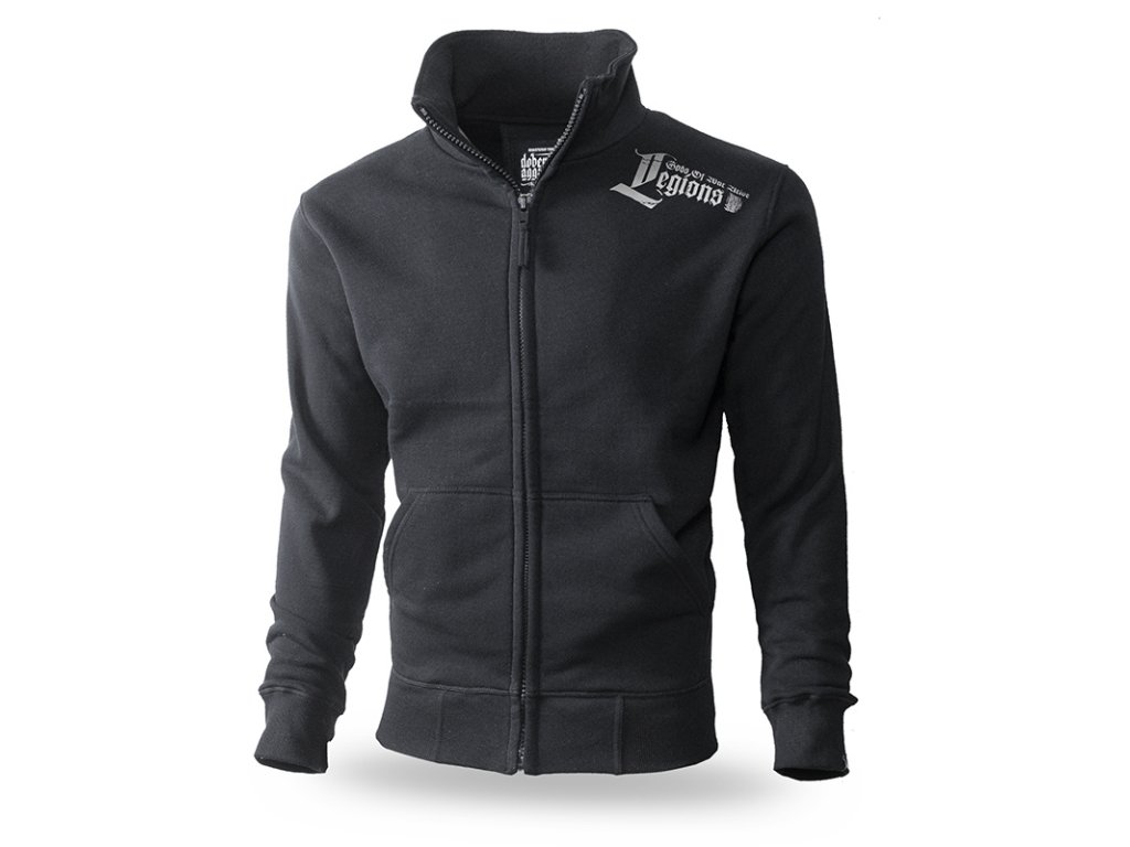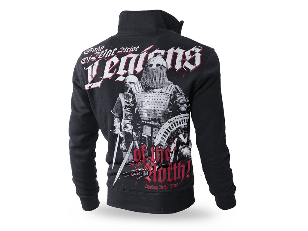 Vepředu jsou dvě našívané kapsy. Zvýšený stojáček skvěle chrání před chladem. Oblečení je vyrobeno z bavlny o vysoké hmotnosti 320g. Uvnitř je cedulka s logem Dobermans Aggressive. Na levém rameni je umístěný nápis Legions. Záda jsou z velké části pokrytá vzorem se dvěma bojovníky vyzbrojenými meči a štíty. Heslo Legions of the North projekt uzavírá. Vzor ve dvou barvách.