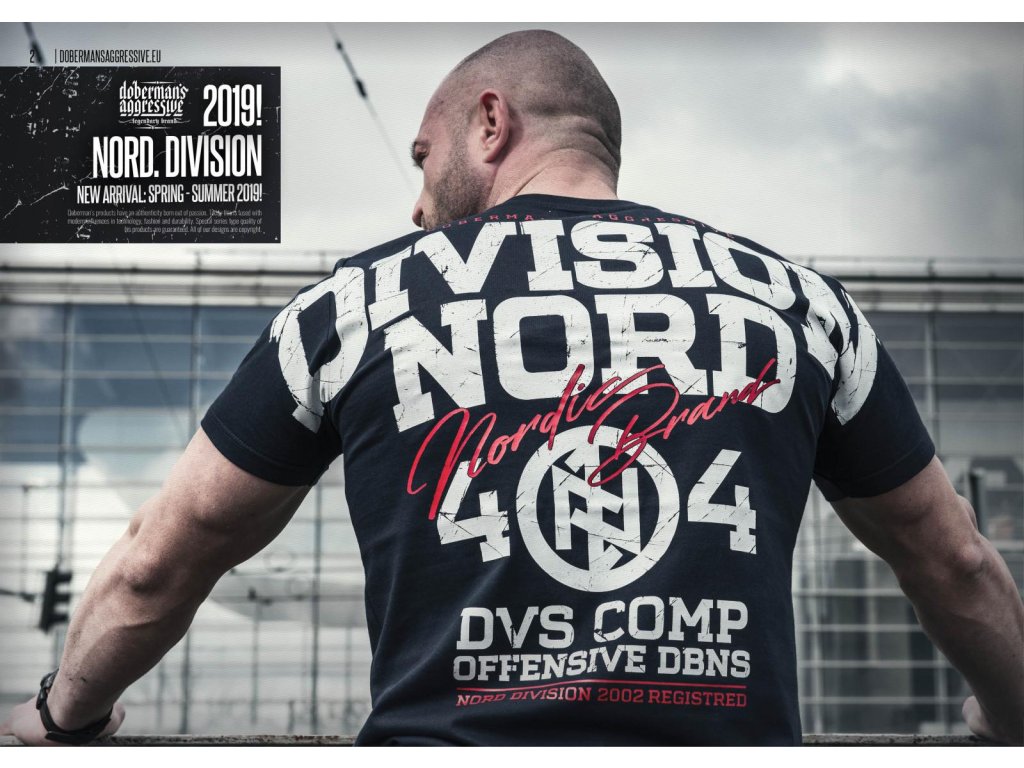 Na levém rukávu je malá cedulka s logem Dobermans. Dolní část a rukávy jsou zakončené širokým stahovacím lemem. Na zádech se nachází dvoubarevný vzor složený z nápisů. Největší z nich, Division, přechází přes švy rukávů. Ozdobný nápis Nordic Brand přidává vzoru na výjimečnosti. Níže je číslo 404 s vepsaným runovým symbolem. Na srdci se nachází menší potisk s opakujícím se motivem čísla.