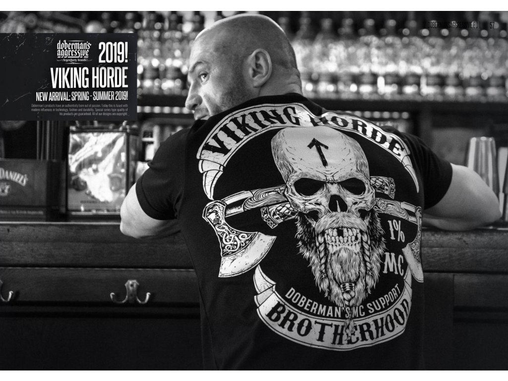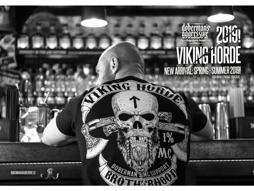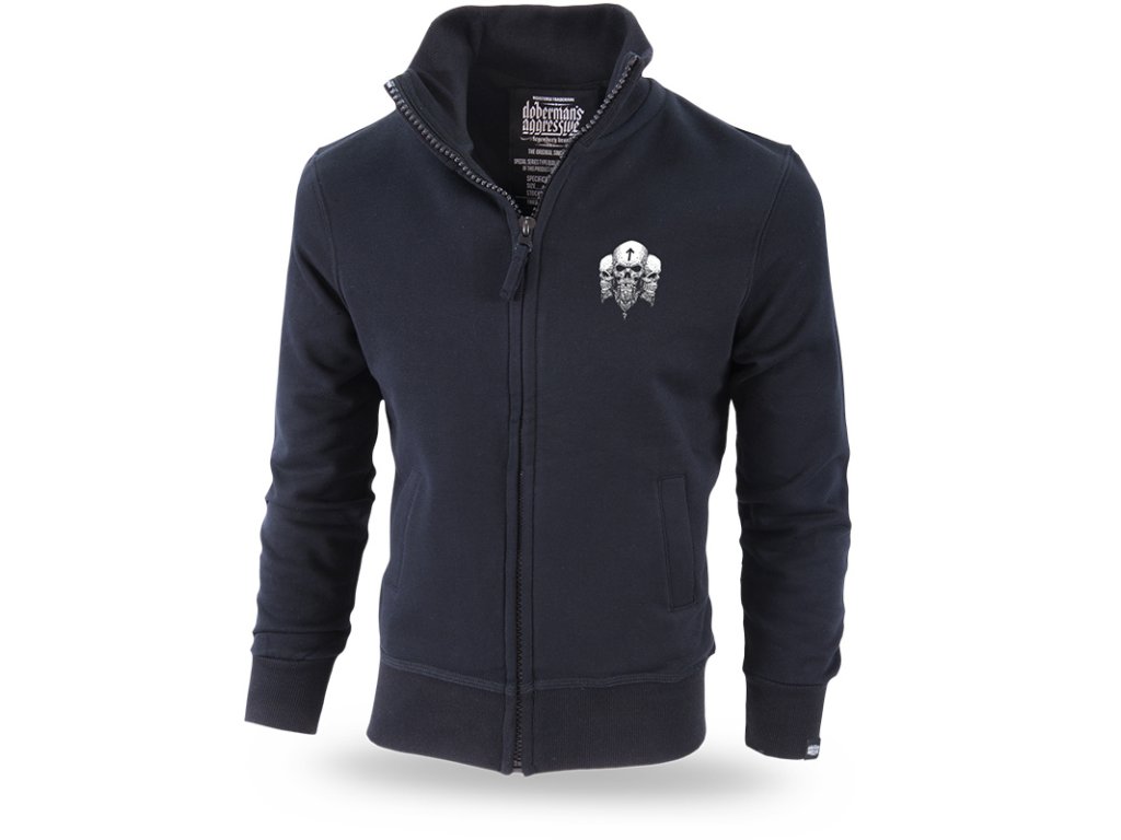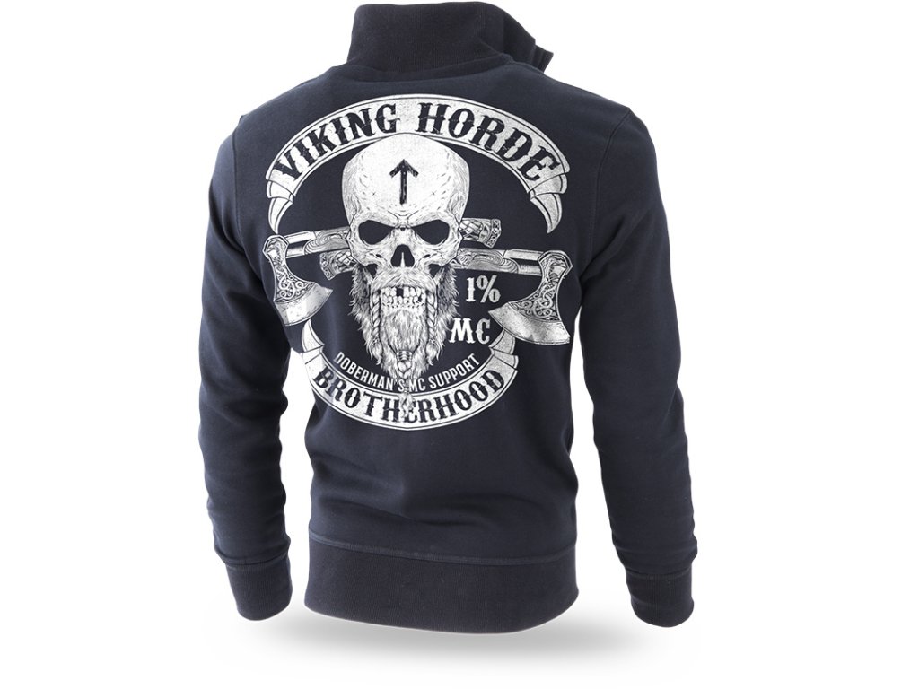 Dvě kapsy na přední straně. Uvnitř je velká cedulka s logem Dobermans Aggressive. Tři nevelké lebky jsou vytištěny na přední straně mikiny. Zadní část je pokrytá vzorem s lebkou Vikinga, za ní se nachází dvě zdobené sekery. Celek je uzavřený dvěma prapory s nápisy Viking Horde a Brotherhood. Vzory navazují na severskou mytologii. Kolekce Vikings.