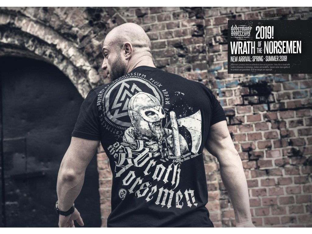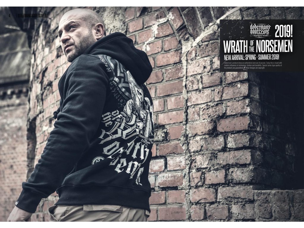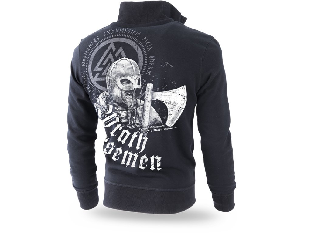 K zakončení mikiny jsou použité široké stahovací lemy. Na levém rukávu je našitá malá cedulka s logem značky. Na levé straně hrudi je potisk s motivem severských symbolů. Záda jsou do značné míry pokrytá potiskem. Vzor s křičícím Vikingem. Vedle se nachází sekera. V pozadí se opakuje runový symbol ve větším měřítku. Celek je uzavřený heslem Wrath of the Norsemen.