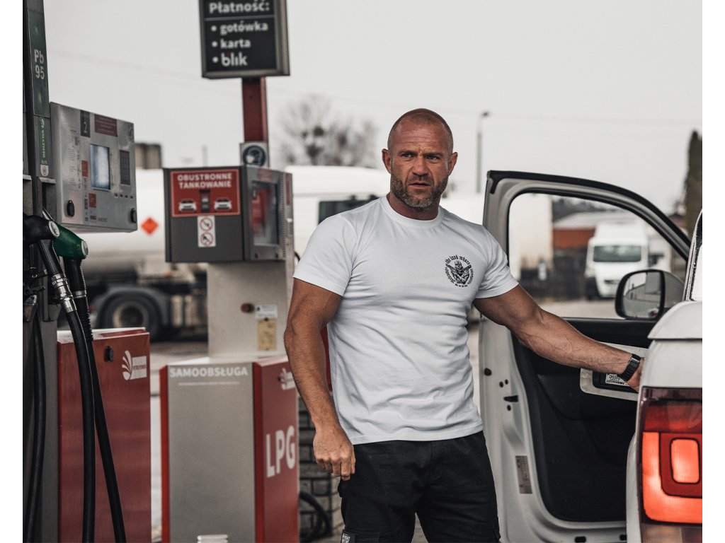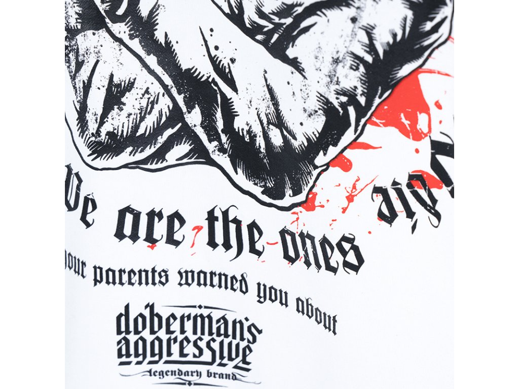 Na levém rukávu je našitá malá cedulka s logem značky. Dolní část mikiny a rukávů je zakončená širokým stahovacím lemem. Na zádech velký potisk zobrazující postavu s hlavou lebky, která drží dvě pistole. Dále nápis „Welcome to the land where strangers die”. Na hrudi je podobný vzor v menším rozměru.