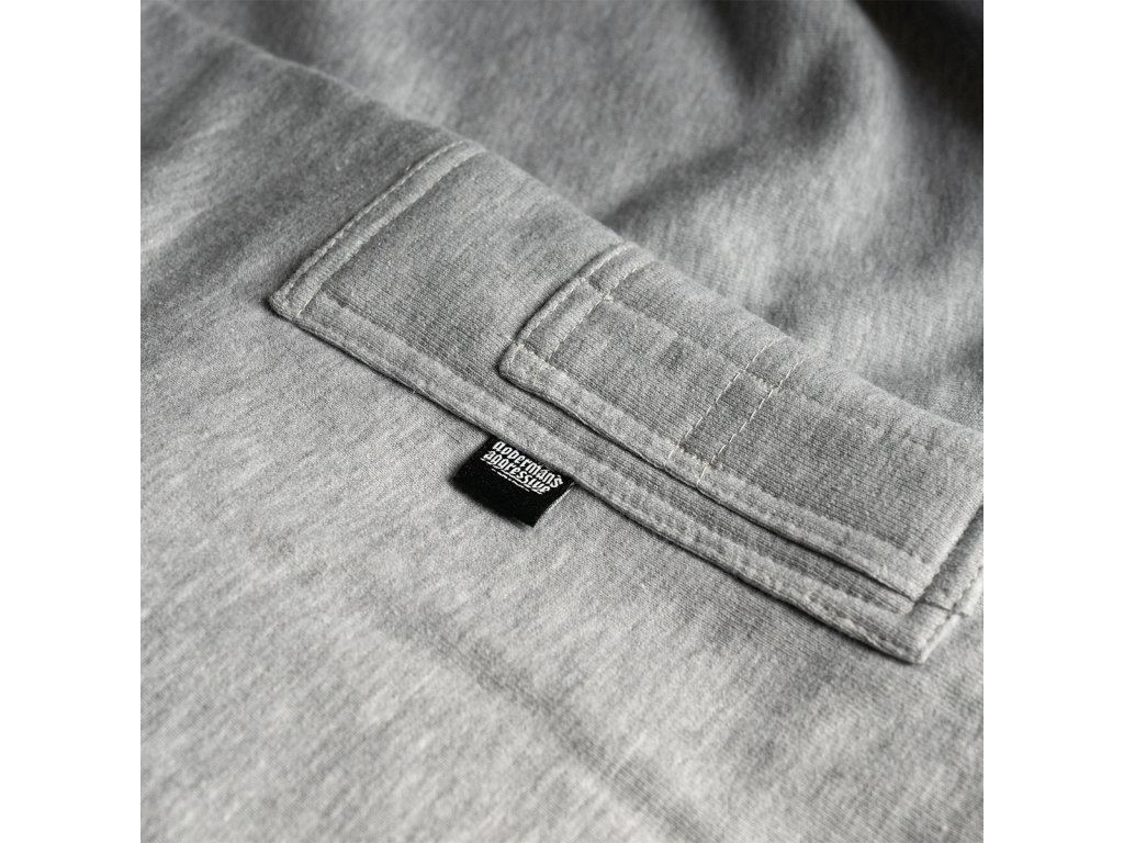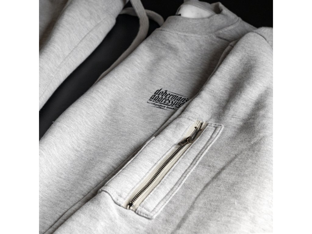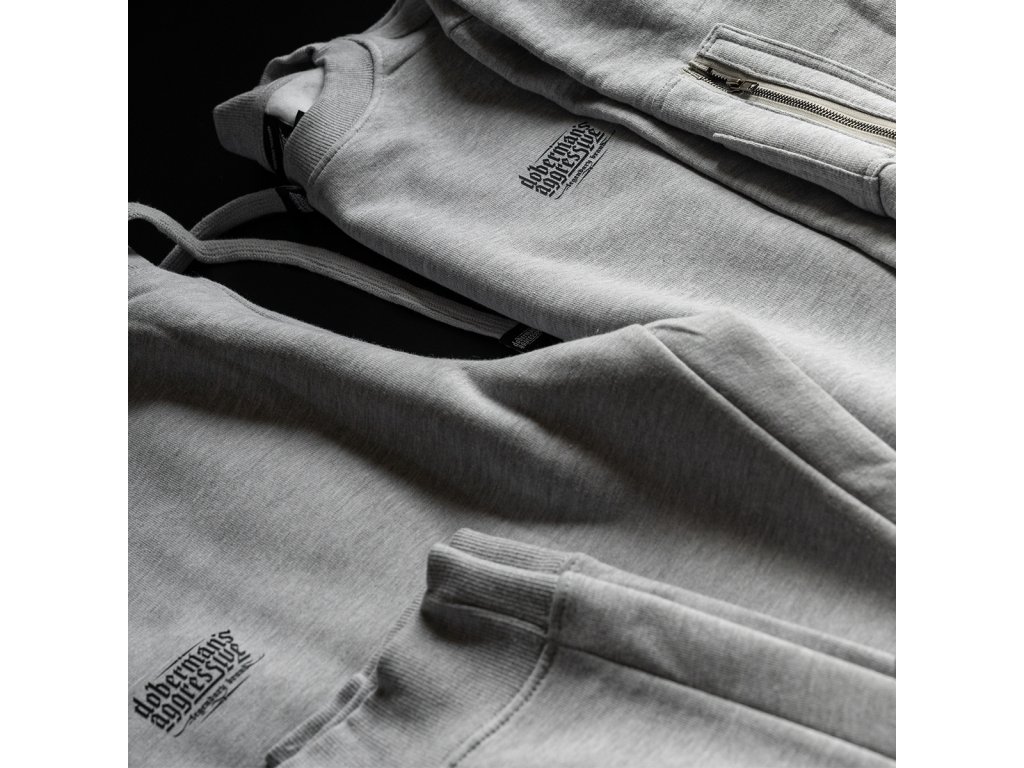 Na levém rukávu je našitá malá cedulka s logem značky. Dolní část mikiny a rukávů je zakončená širokým stahovacím lemem. Na přední straně mikiny na levé straně hrudníku je malé jednobarevné logo značky Doberman’s. Model s dodatečnou kapsou na rukávu se zapínáním na zip.