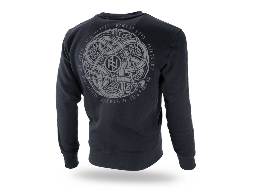 U krku vnitřní plisování v červené barvě, v dolní části cedulka s logem značky. Mikina s klasickým vzorem kolekce Celtic. Skandinávská stylistika. Na zádech velký, jednobarevný vzor zobrazující keltské uzly, hlavy severských draků a také runové znaky. Stejný potisk je zopakovaný na přední straně mikiny v menší velikosti.