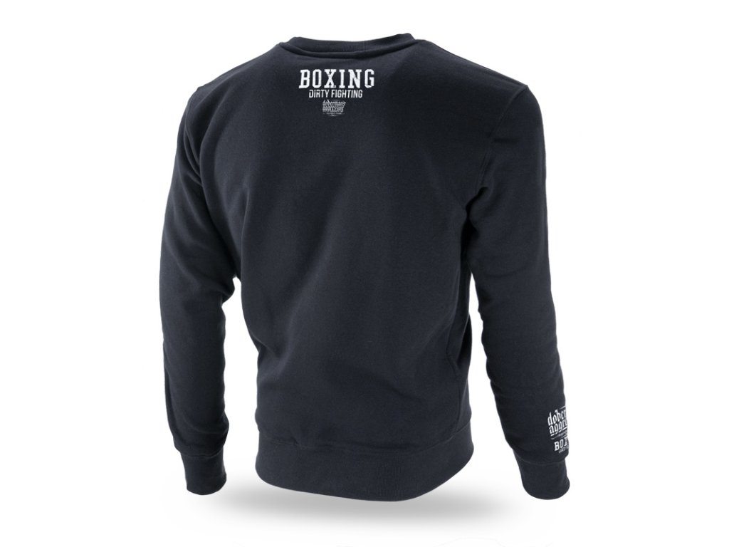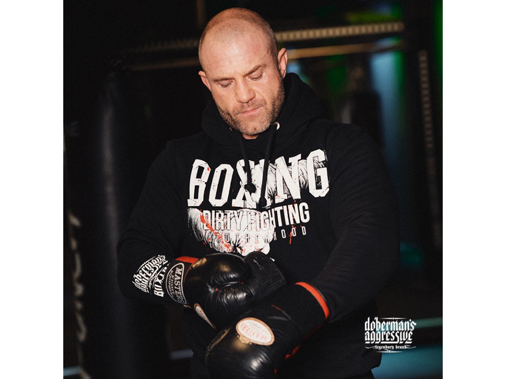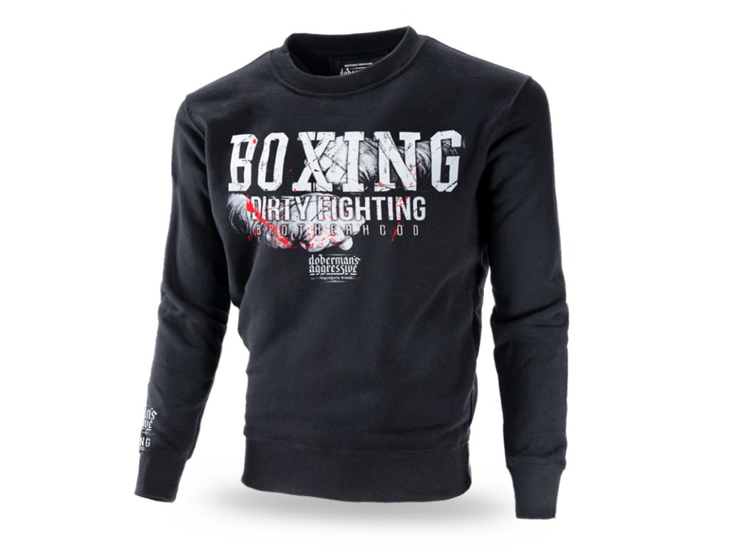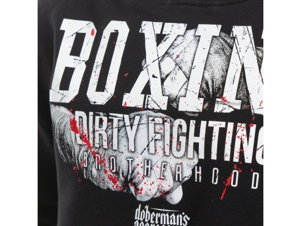 Vyrobena z vysoce kvalitní bavlny. Na levém rukávu je menší s logem značky Dobermans Aggressive. Na pravém rukávu je nad zápěstím potisk s logem značky a nápisem BOXING DIRTY FIGHTING. Na přední straně je nápis BOXING DIRTY FIGHTING a logo značky na pozadí sevřných boxerských pěstí. Zadní strana je bez nápisu, na krku miniatura vzoru, který se nachází na přední straně mikiny.