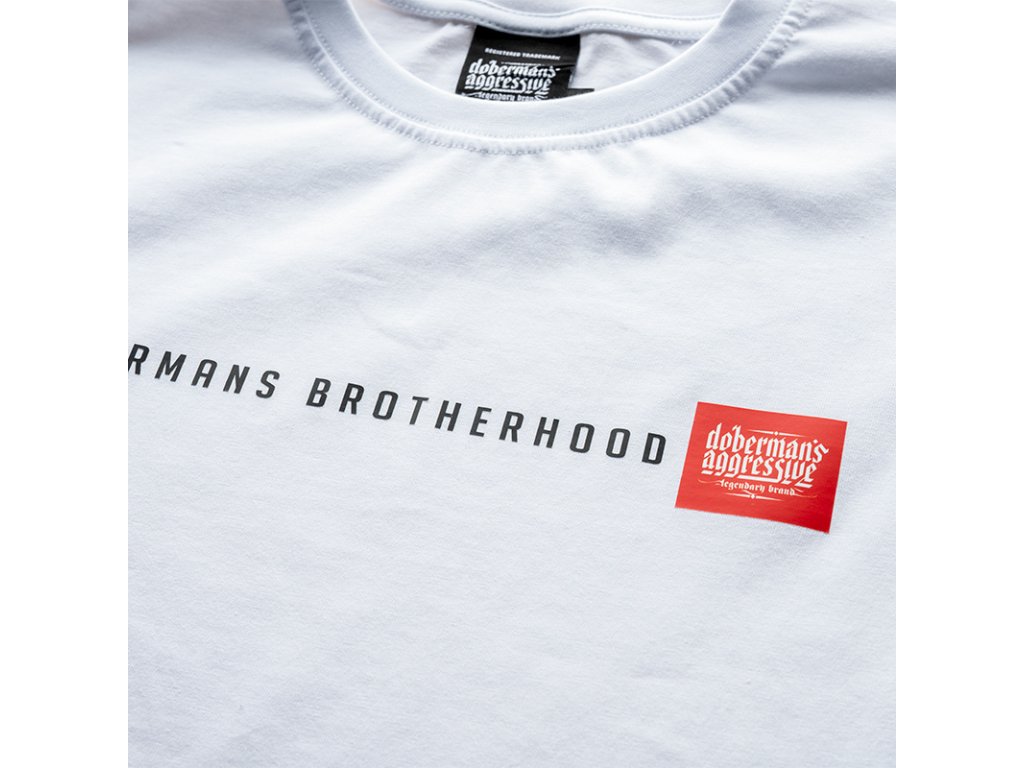Na levém rukávu je našitá malá cedulka s logem značky. Dolní část mikiny a rukávů je zakončená širokým stahovacím lemem. Model v neutrálním stylu. Nápis DOBERMANS BROTHERHOOD a malé logo značky.