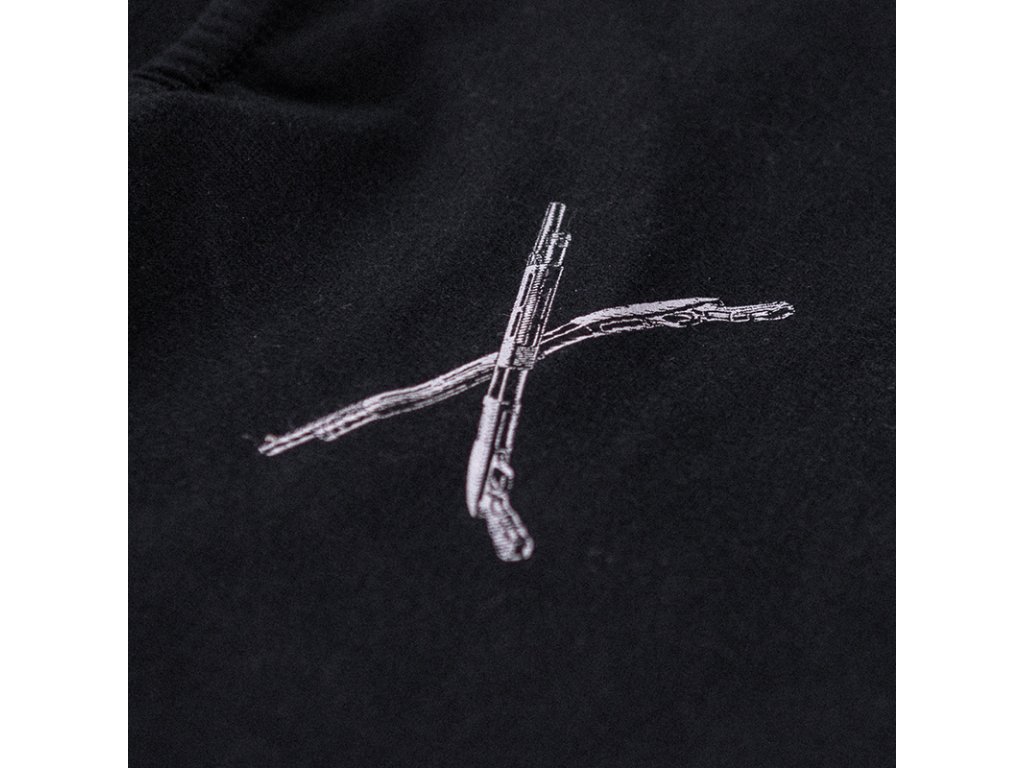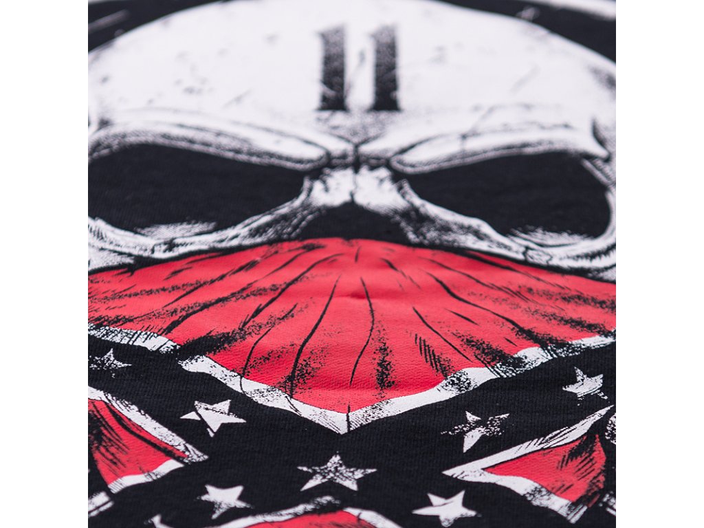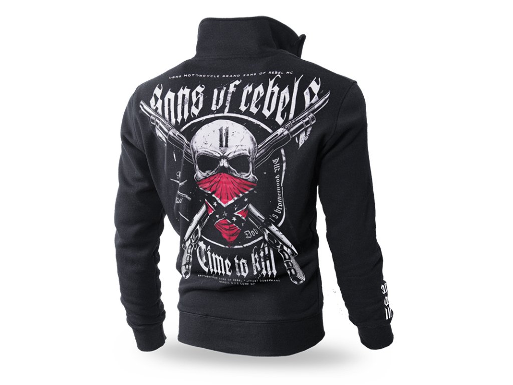 Pohodlný střih na zip, se dvěma kapsami, zakončený stahovacím lemem na rukávech, u krku a v dolní části mikiny. Na hrudi jsou zkřížené brokovnice, na jednom rukávu je cedulka a na druhém je naše logo doprovázené heslem „Time to Kill”. Hlavní vzor tohoto modelu se nachází na zádech: originální, navazuje na motorkářský styl - zkřížené brokovnice a uprostřed lebka v konfederační čepici, kromě toho grafiku doplňují hesla Time to Kill a Sons of Rebel vytvořené gotickým písmem, které dohromady vytváří velice efektivní celek.