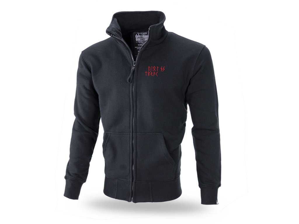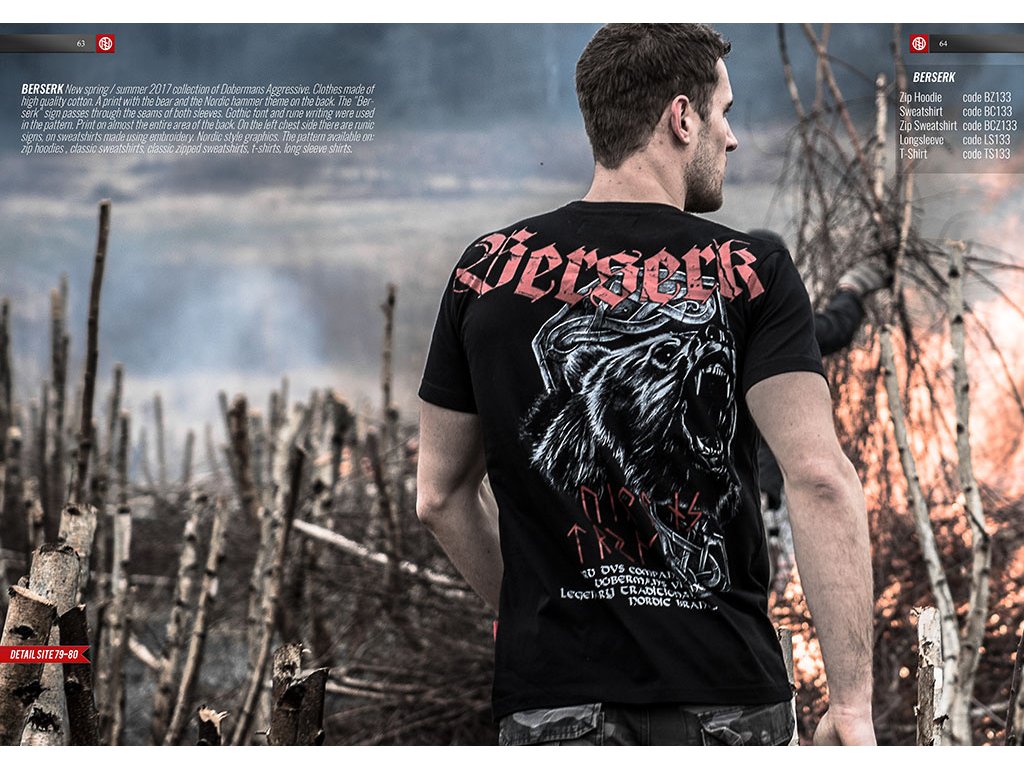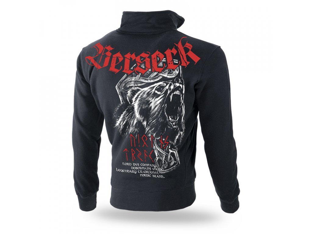 Uvnitř červené plisování a barevný štítek s motivem orla. Na boku mikiny firemní cedulka. Zadní strana zdobená vzorem, který zabírá téměř celý povrch látky. Na ramenou velký nápis Berserk v červené barvě, který přechází přes švy rukávů, níže hlava medvěda, runy a logo značky. Potisk s efektem předření. Na přední straně runové znaky v podobě výšivky provedené přímo na látce mikiny.