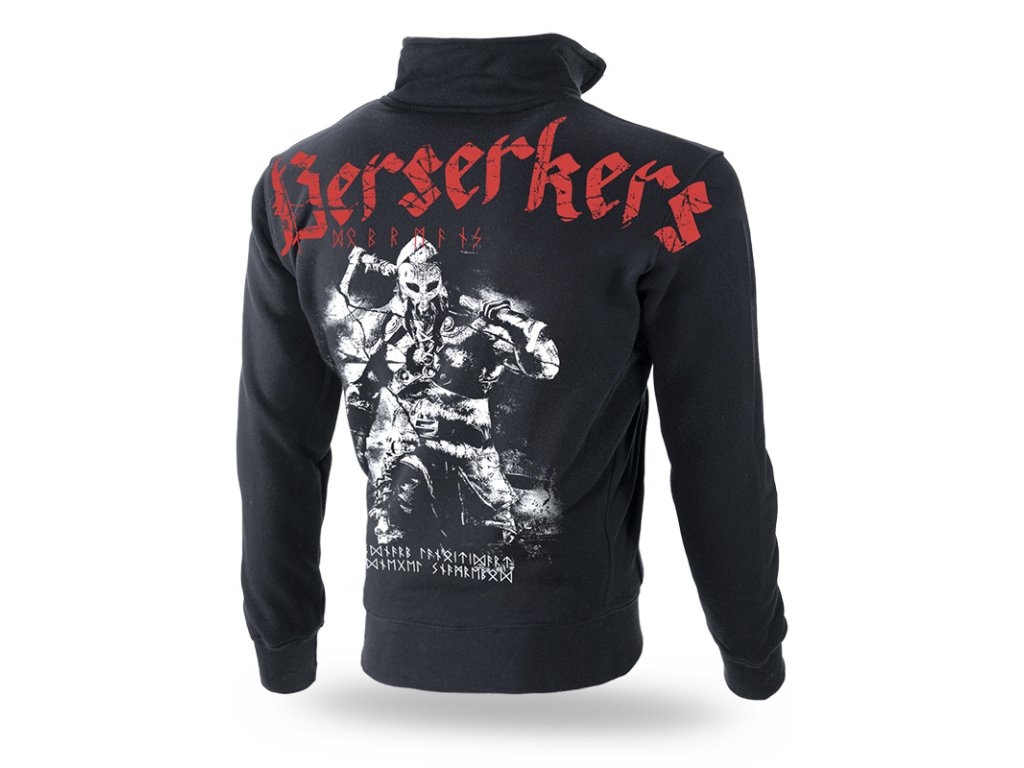 Dolní část mikiny je zakončená širokými stahovacími lemy. U krku červené plisování, na boku firemní štítek. Na přední straně potisk podél levého švu. Použity runové symboly. Zadní část zdobená velkým vzorem s postavou Vikinga držícího sekyru. Vysoko na zádech nápis Berserkers přecházející přes švy obou rukávů, níže runové znaky.