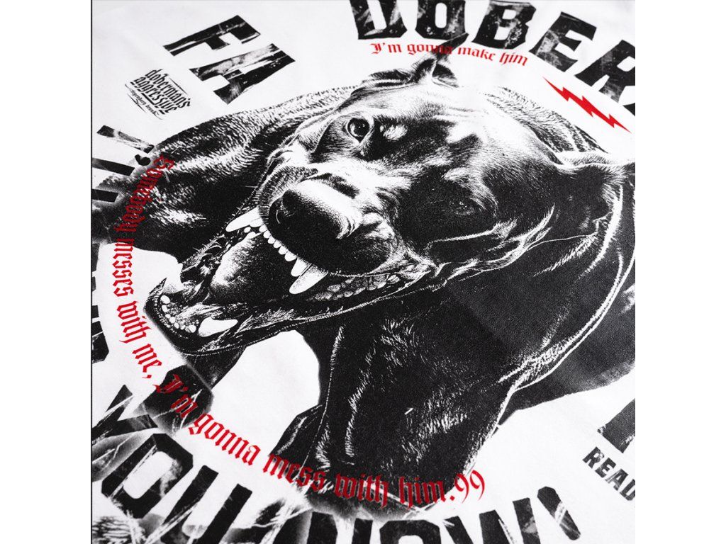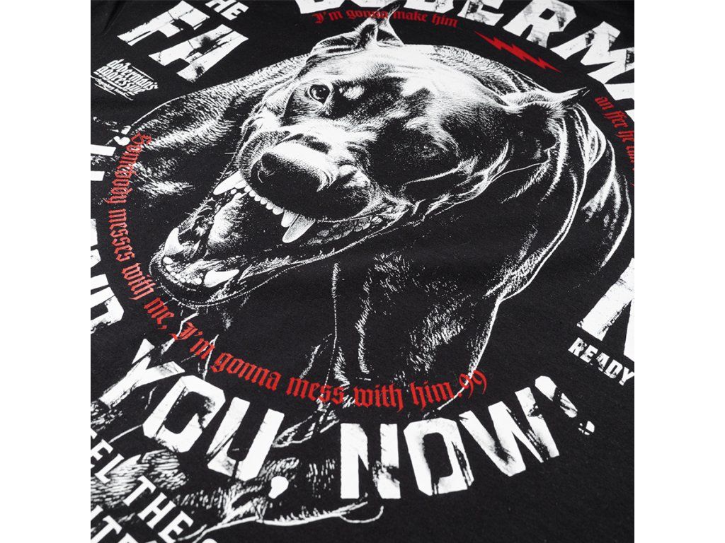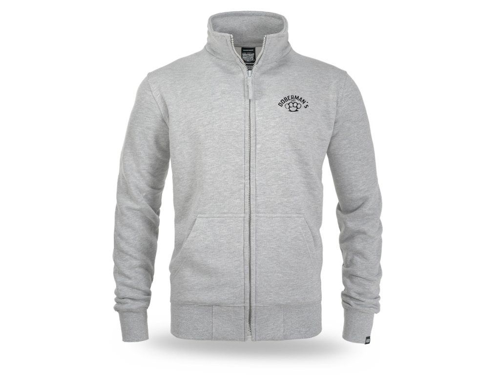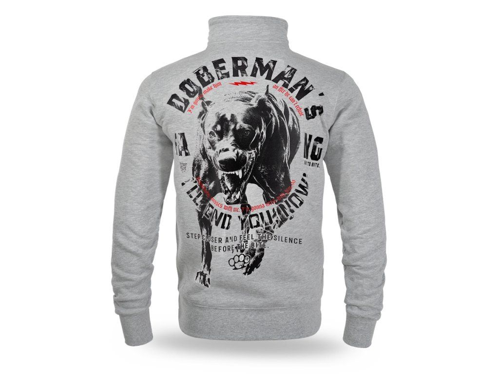 Model zapínaný na zip s vyšším stojáčkem a dvěma praktickými předními kapsami. Na zadní straně se nachází velká, výrazná grafika agresivního dobrmana v dynamické útočné póze, doplněná silnými slogany zdůrazňujícími nekompromisní charakter designu. Na hrudi je umístěn menší potisk s názvem značky a motivem boxeru. Rukávy a spodní lem jsou zakončeny elastickými náplety pro lepší přizpůsobení a pohodlí při nošení. Celkový vzhled odráží charakteristický, výrazný styl značky Doberman’s Aggressive.