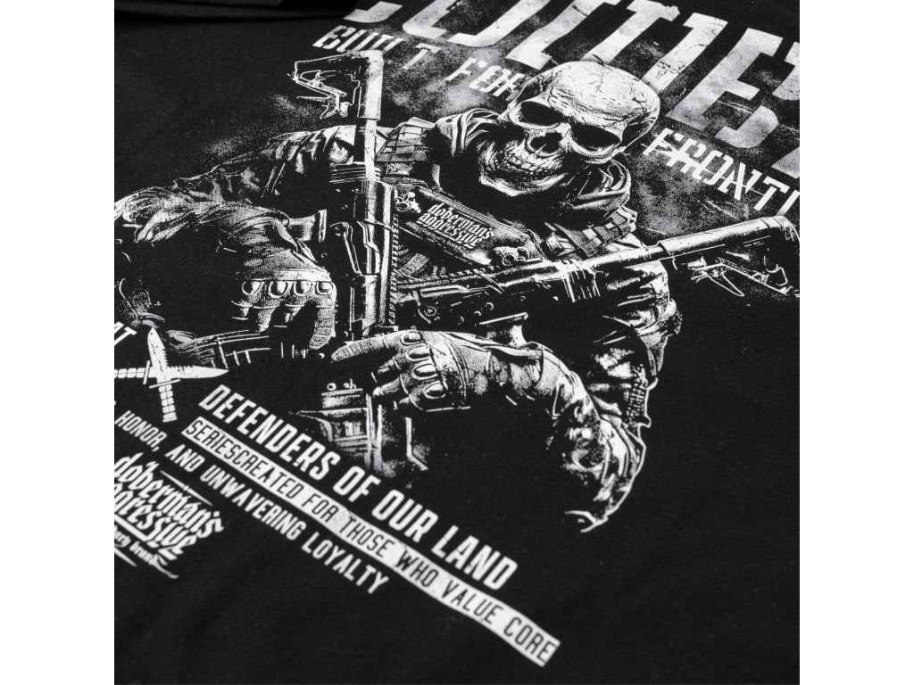 Na zádech je umístěna velká, výrazná grafika s taktickým motivem a sloganem „Combat – Built for the Frontline“, zdůrazňující vojenský charakter kolekce. Na hrudi je menší emblém navazující na hlavní motiv. Spodní lem a manžety jsou zakončeny elastickým úpletem pro lepší přizpůsobení a pohodlí při nošení. Model spojuje funkčnost s výrazným stylem inspirovaným vojenskou estetikou.