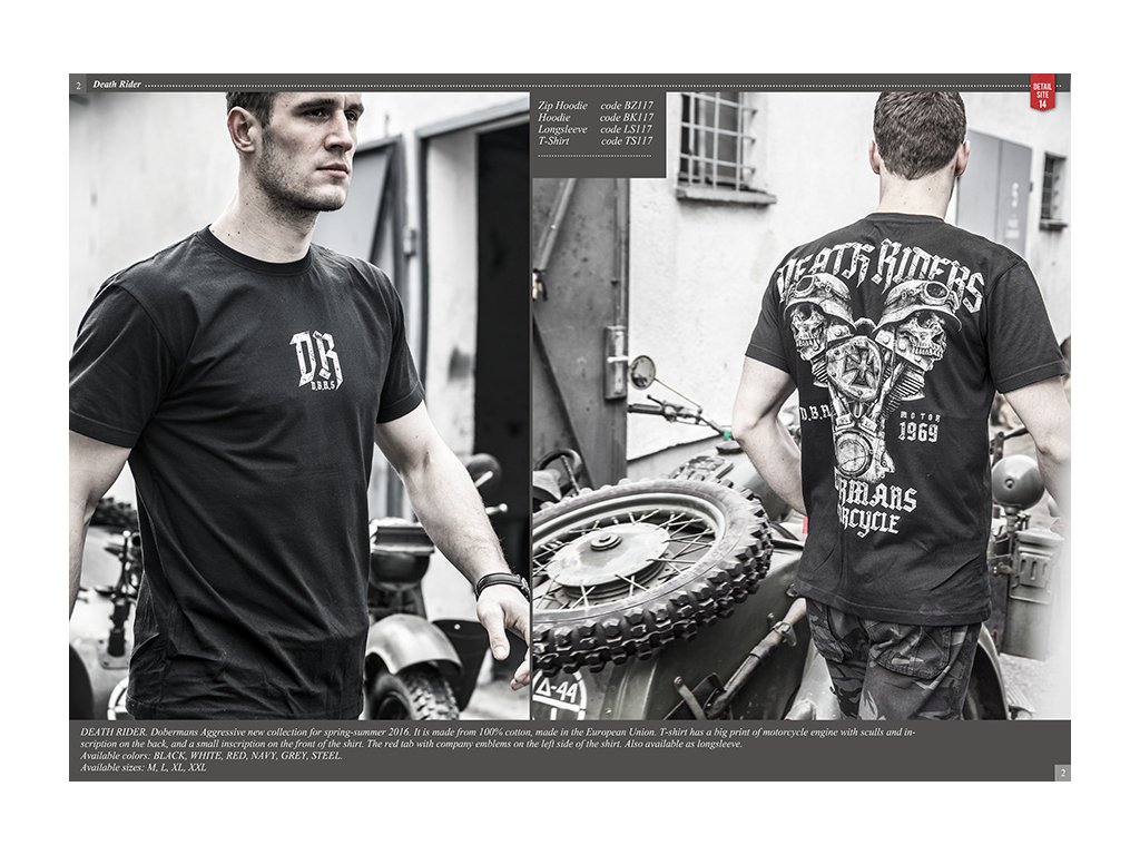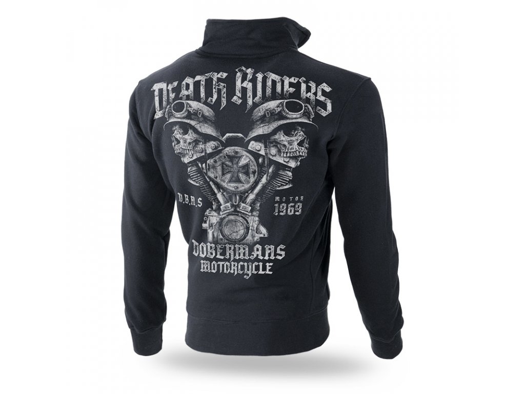 Má zip a vysoký límec. Vyrobena ze stoprocentní bavlny o hmotnosti 320g. Na zadní straně potisk s motivy, které jsou typické pro kolekci Death Rider: uprostřed motocyklový motor, výše dvě lebky v helmách s brýlemi. Ve výšce lopatek název kolekce, pod vzorem nápis Dobermans Motocycle. Potisk s efektem předření, který zabírá téměř celý povrch zad. Na pravé straně hrudi zkratka DR s označením D.B.N.S.