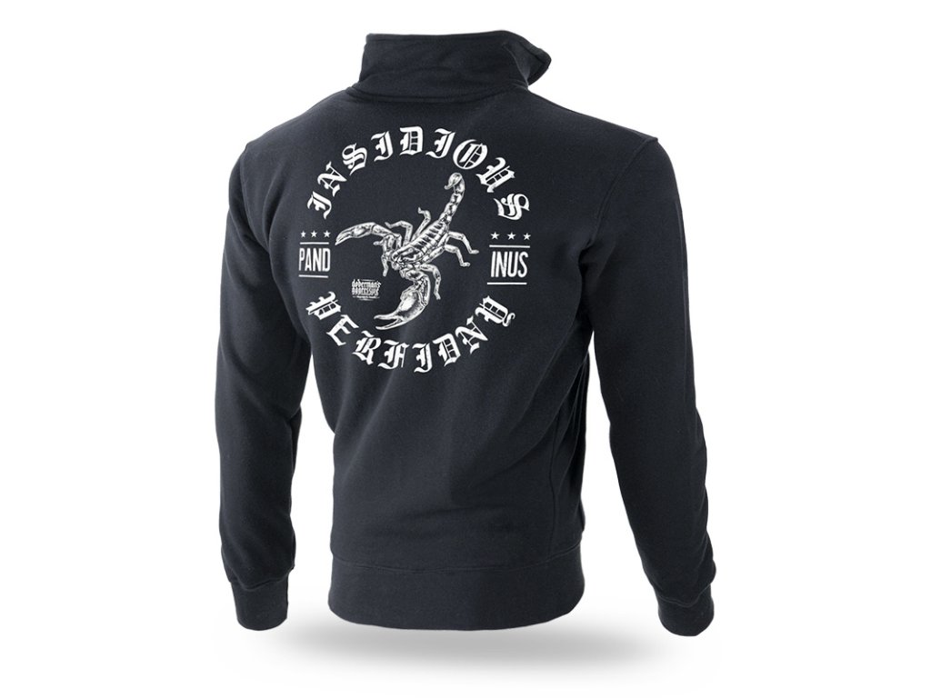 Dvě kapsy jsou na přední straně, na levém rukávu je malá cedulka s logem Dobermans Aggressive. Spodní část mikiny a rukávy jsou zakončené pevnými stahovacími lemy. Mikina je vyrobena z vysoce kvalitní bavlny. Model INSIDIOUS s charakteristickým vzorem na zádech, zobrazuje škorpióna s přidáním gotických nápisů. Na přední straně je menší vzor, který navazuje na zadní stranu trička.