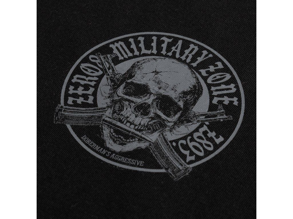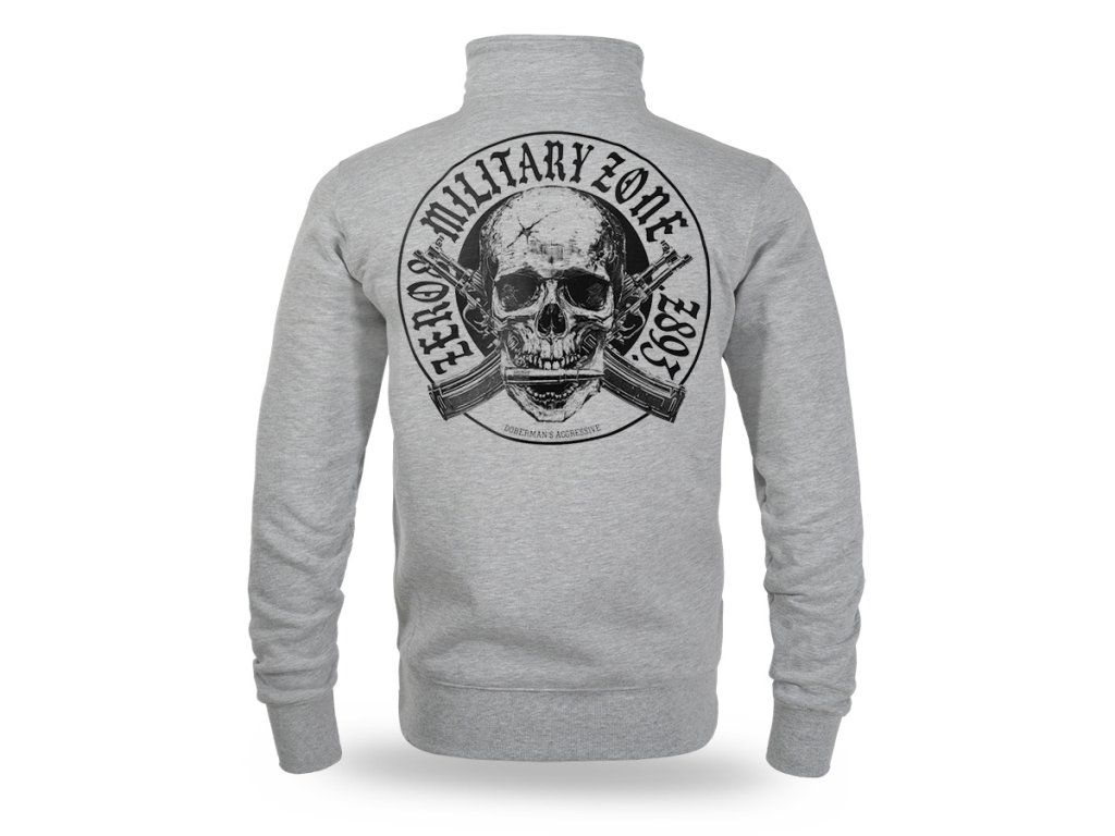 Model vyrobený v pohodlném klasickém střihu se stojáčkem a zapínáním na zip po celé délce. Na zádech se nachází velká výrazná grafika zobrazující lebku na pozadí zkřížených pušek, obklopenou nápisem „Frontline Military Zone 1987“. Motiv je inspirován vojenskou estetikou a zdůrazňuje syrový a rozhodný charakter designu. Na hrudi je umístěn menší potisk navazující na grafiku na zádech, který doplňuje celkovou kompozici. Mikina má dvě praktické přední kapsy a elastické náplety na rukávech i spodním lemu, které zajišťují dobré přizpůsobení a pohodlí při nošení.