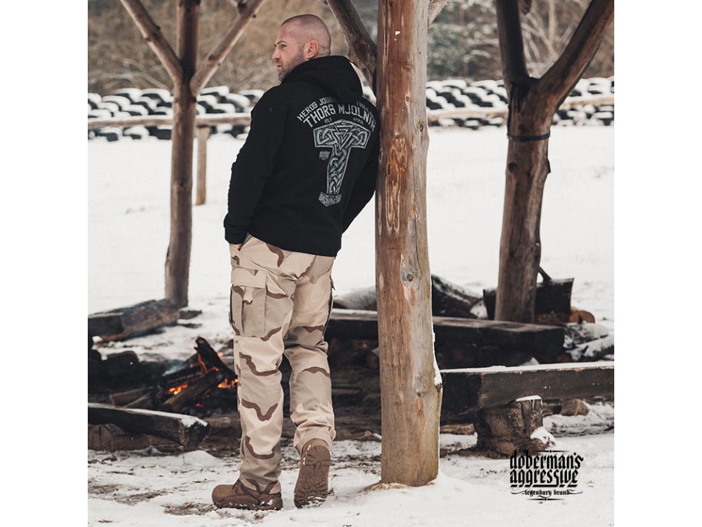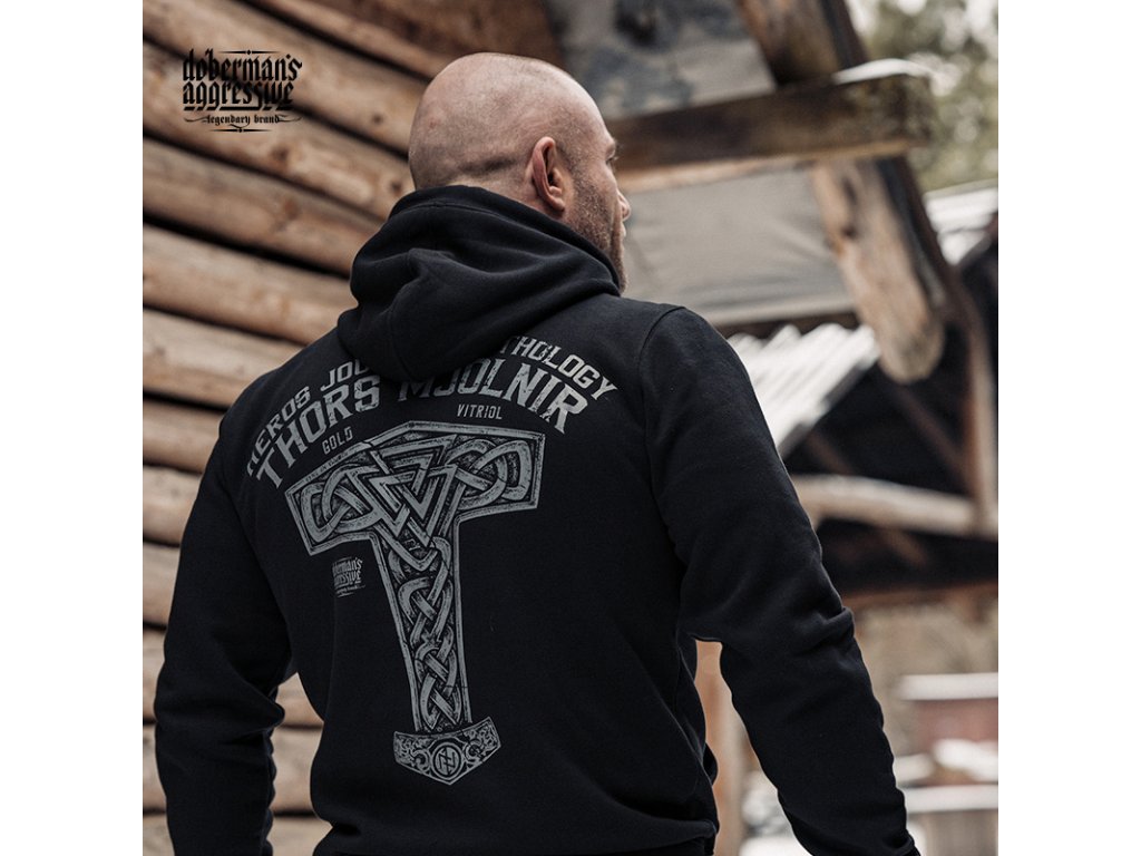 Levý rukáv s našitou malou cedulkou Doberman’s Aggressive. Na zádech je vzor, který zobrazuje Thorovo kladivo s nápisem HEROS JOURNEY MYTHOLOGY THORS MJOLNIR a logo značky. Na levé straně hrudi je miniatura vzoru Thorova kladiva.