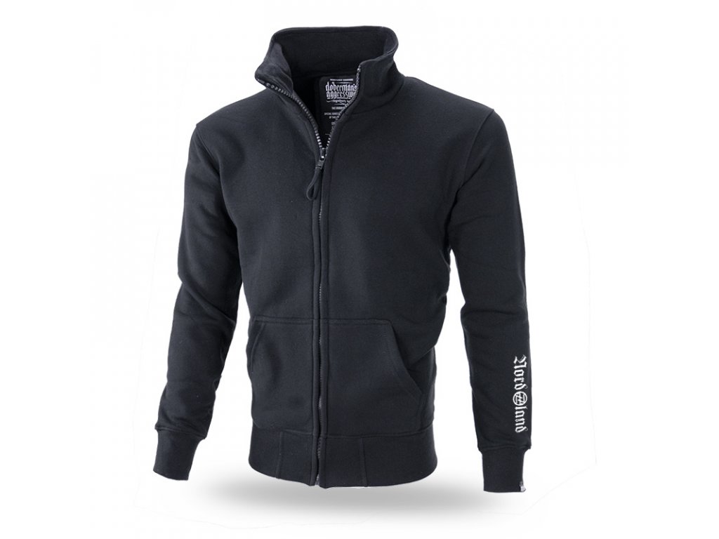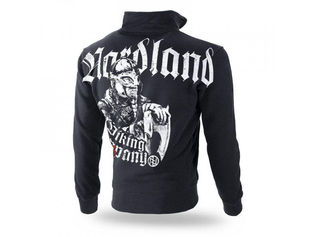 Model se zapínáním vysoko u krku a zakončený širokými stahovacími lemy. Má dvě praktické kapsy, vnitřní lemování a boční štítek s logem značky. Na zádech velký vzor s postavou Vikinga opřeného o sekeru, heslem Viking Company a číslem 793. Výše nápis Nordland v gotickém stylu, který přechází přes švy obou rukávů a opakuje se na přední straně mikiny podél levého boku v menším měřítku. Použitý efekt popraskání potisku.