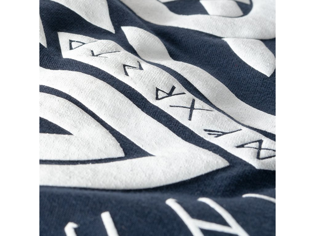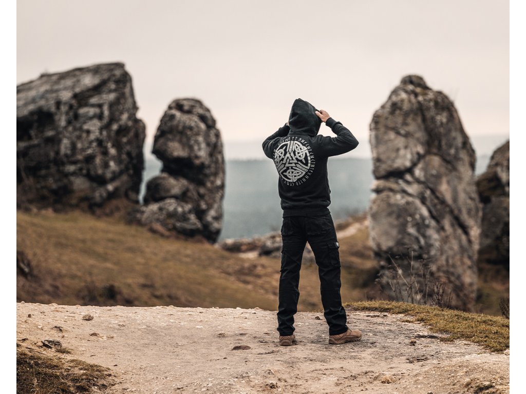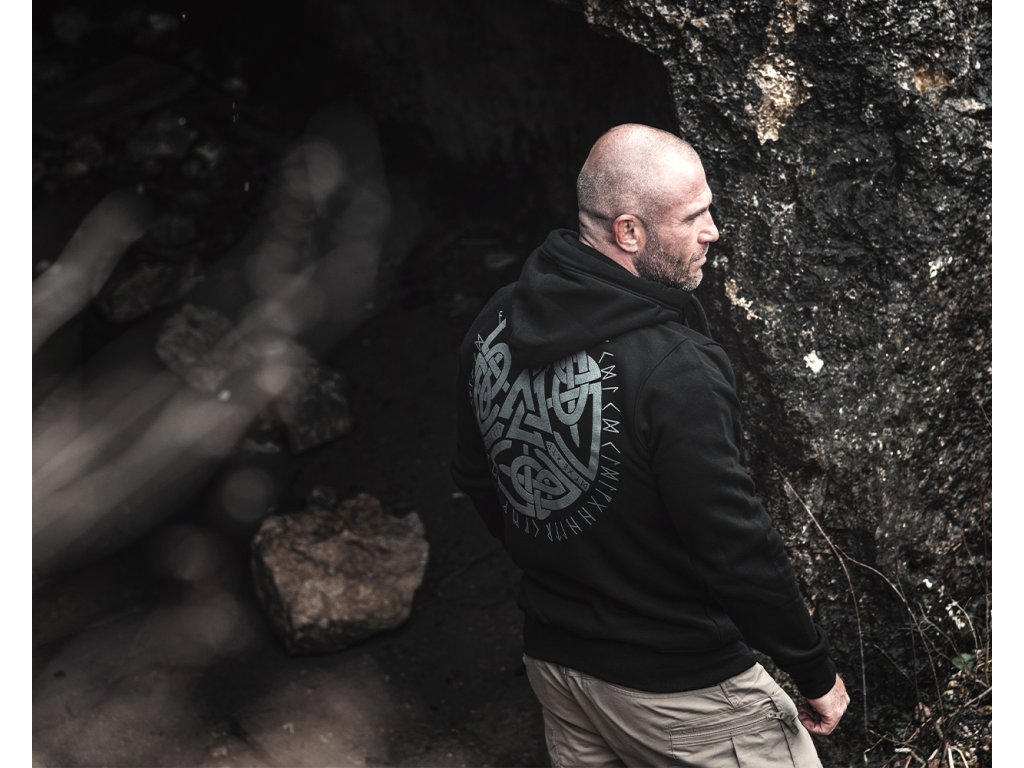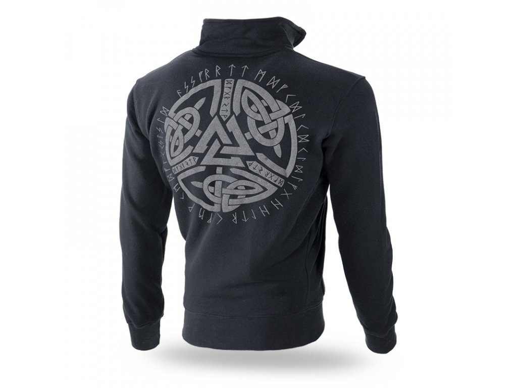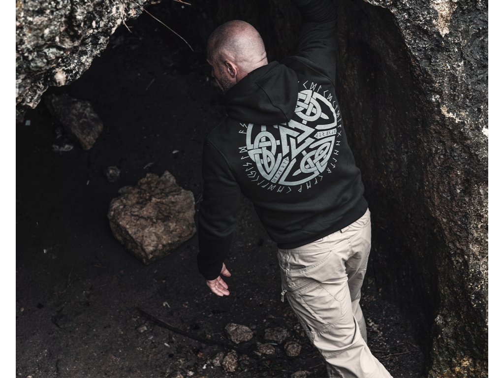 Dvě kapsy jsou na přední straně, na levém rukávu je malá cedulka s logem Dobermans Aggressive. Spodní část mikiny a rukávy jsou zakončené pevnými stahovacími lemy. Mikina je vyrobena z vysoce kvalitní bavlny. Na přední straně mikiny se nachází malá vyšívaná nášivka se severským symbolem. Zadní stranu mikiny zdobí velký potisk v severském stylu vytvořený metodou vypouklého potisku.