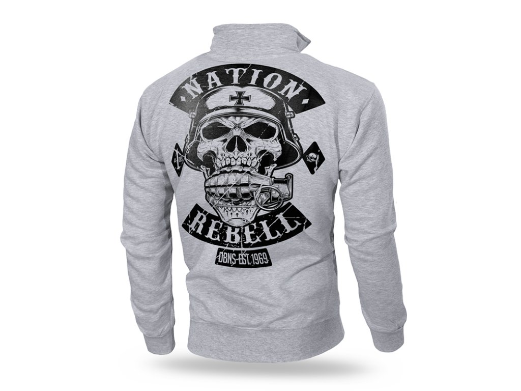 Na vojenské helmě je maltézský kříž. Výše a níže prapory s heslem Nation Rebell, po stranách dvě karty. V dolní části označení DBNS-EST.1969. Vzor zabírá téměř celý povrch zad. Na hrudi nevelké logo s číslem 44 a nápisem Rebell. Jednobarevný potisk, s viditelným efektem popraskání. Mikina se zapínáním vysoko u krku, zakončená stahovacími lemy, podél krku zpevněná vnitřním lemováním. Model vyrobený z bavlněné látky o hmotnosti 320g. Na přední straně dvě našité kapsy.
