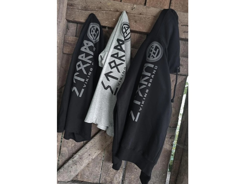 Dvě kapsy jsou na přední straně, na levém rukávu je malá cedulka s logem Dobermans Aggressive. Spodní část mikiny a rukávy jsou zakončené pevnými stahovacími lemy. Mikina je vyrobena z vysoce kvalitní bavlny. Na zádech je nápis STORM VIKING BRAND a také severský symbol provedený metodou vypouklého potisku. Na přední straně mikiny na hrudi je malá vyšívaná nášivka, která připomíná hlavní motiv.