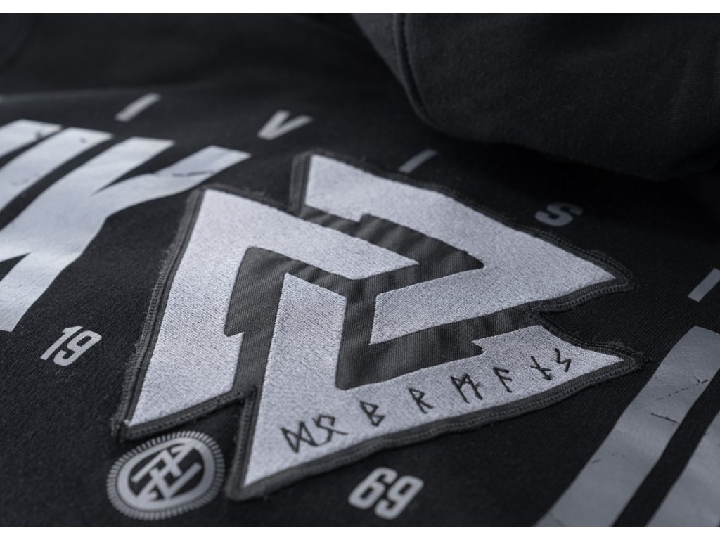 Vyrobená z vysoce kvalitní bavlny, zakončená stahovacími lemy, se dvěma kapsami na přední straně. Na levém rukávu je malá cedulka s logem značky. Mikina ze série Valknut inspirované severskou symbolikou. Zadní část mikiny je zdobená kombinací vyšívaného symbolu Valknut a potisku Viking Division. Na levé straně hrudi je vyšívaná miniatura skandinávského symbolu.