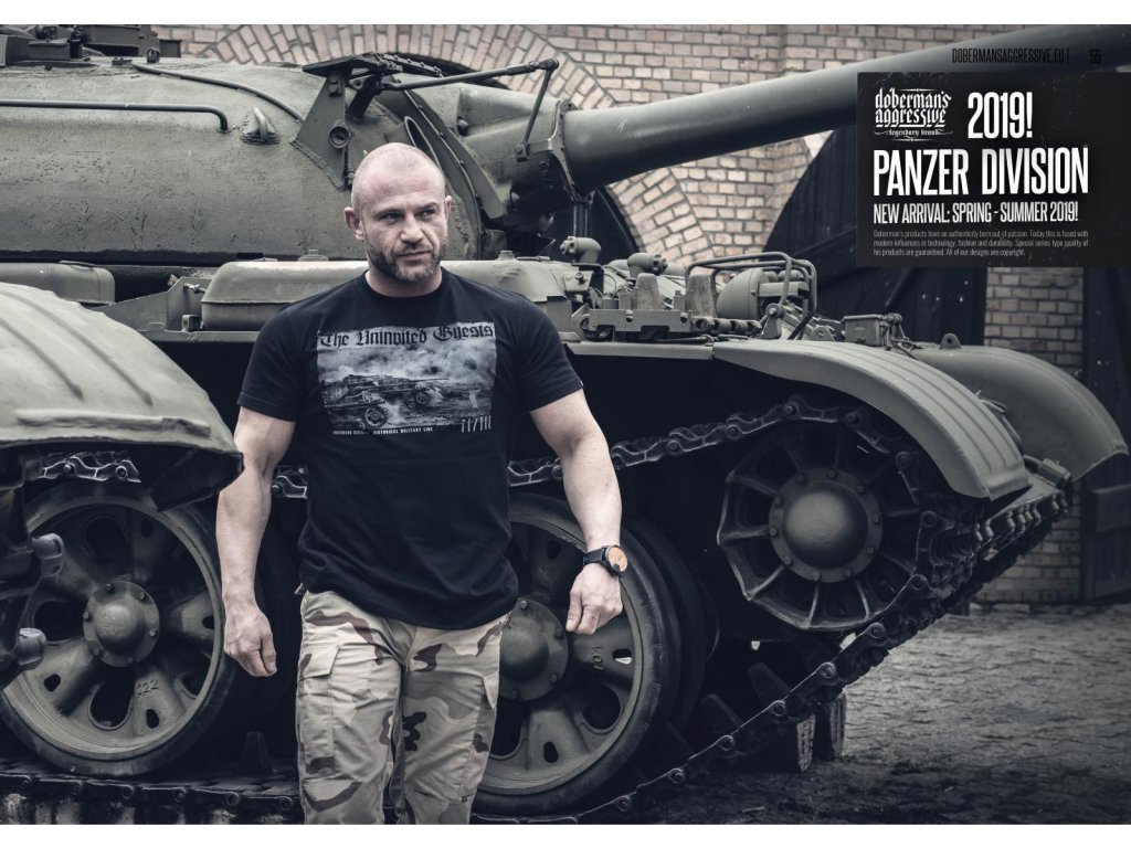 Široké stahovací lemy jsou také na spodní straně mikiny a u rukávů. Na levém rukávu je malá cedulka s logem značky. Model vyrobený z vysoce kvalitní bavlny o hmotnosti 320g. Na přední straně mikiny je vzor se třemi tanky, které jedou po bitevním poli. Na zádech je jednobarevný potisk s vojenskou specifikací a velký nápis Panzer Division. Použitý efekt poničení. Vzor z historické kolekce.