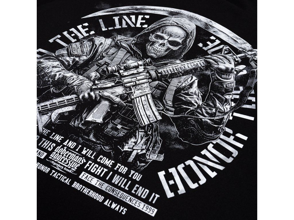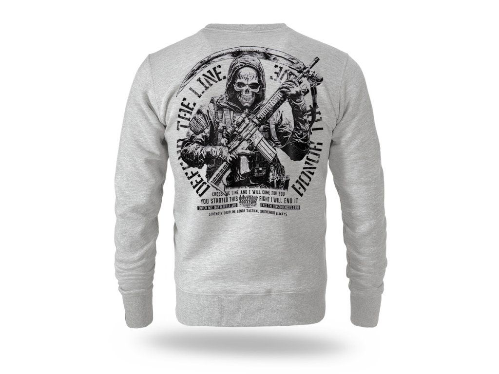 Model je vyroben v pohodlném sportovním střihu s kulatým výstřihem a žebrovanými lemy na rukávech a spodním okraji pro lepší přizpůsobení a komfort při nošení. Na zadní straně se nachází velký potisk zobrazující postavu v taktickém stylu s vojenským motivem a nápis „Protect – Live – Honor“, který zdůrazňuje hodnoty jako odvaha, loajalita a připravenost k akci. Na hrudi je umístěno menší logo v minimalistickém stylu. Mikina je navržena pro každodenní nošení a kombinuje pohodlí s výrazným stylem inspirovaným vojenskou a taktickou estetikou. Pečlivě zpracovaný potisk a kvalitní provedení zdůrazňují charakter a odolnost modelu.