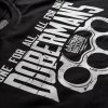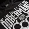 Na levém rukávu je našitá malá cedulka s logem značky. Dolní část mikiny a rukávů je zakončená širokým stahovacím lemem. Na přední straně mikiny je velký nápis DOBERMANS s nápisem One For All, All For one. Celek je zakončený vzorem boxeru a logem značky.
