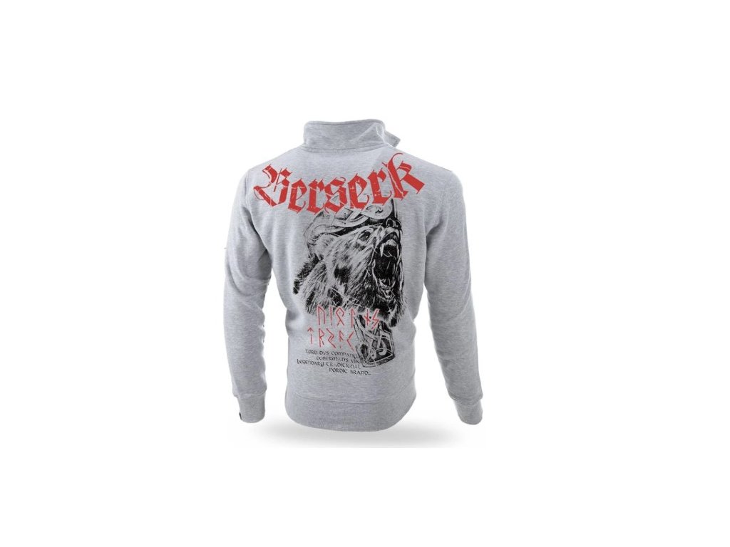Uvnitř červené plisování a barevný štítek s motivem orla. Na boku mikiny firemní cedulka. Zadní strana zdobená vzorem, který zabírá téměř celý povrch látky. Na ramenou velký nápis Berserk v červené barvě, který přechází přes švy rukávů, níže hlava medvěda, runy a logo značky. Potisk s efektem předření. Na přední straně runové znaky v podobě výšivky provedené přímo na látce mikiny.