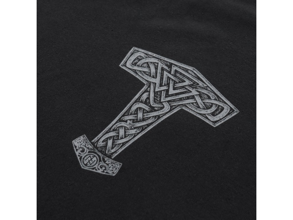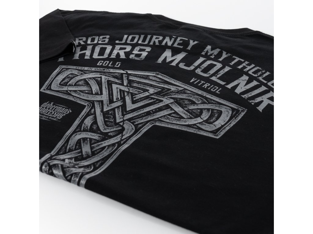Na levém rukávu je našitá malá cedulka s logem značky. Na zádech je vzor, který zobrazuje Thorovo kladivo s nápisem HEROS JOURNEY MYTHOLOGY THORS MJOLNIR a logo Doberman’s Aggressive. Na levé straně hrudi je miniatura vzoru Thorova kladiva.