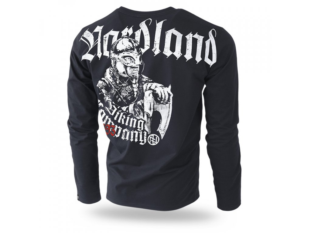 Klasický pánský střih s rovným rukávem a stahovacím lemem u krku. Uvnitř červené lemování. Na přední straně nevelký nápis Nordland, který se nachází podél levého švu a opakuje se na lopatkách ve větším měřítku. Uprostřed zad je vzor s velkým povrchem - vzor s postavou Vikinga, potiskem Viking Company v podobě oblouku a štítem s runovými znaky. Přidáno číslo 793 v kontrastní barvě. Skandinávský styl.