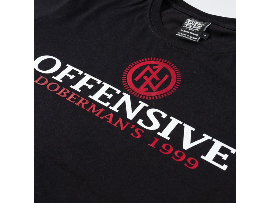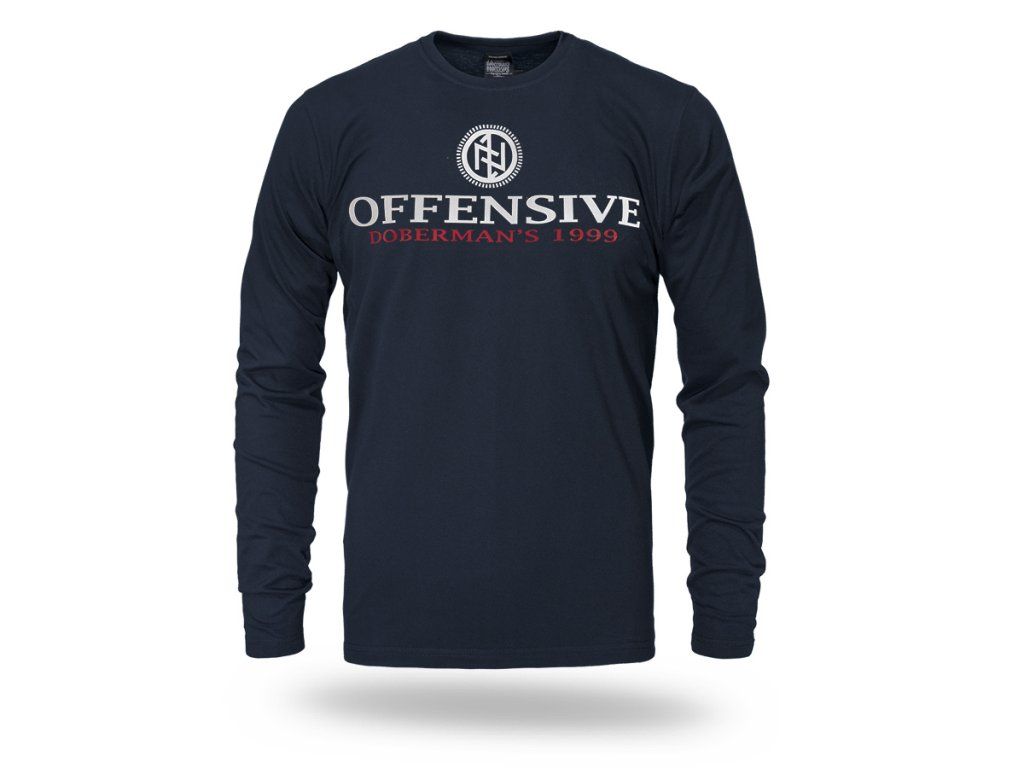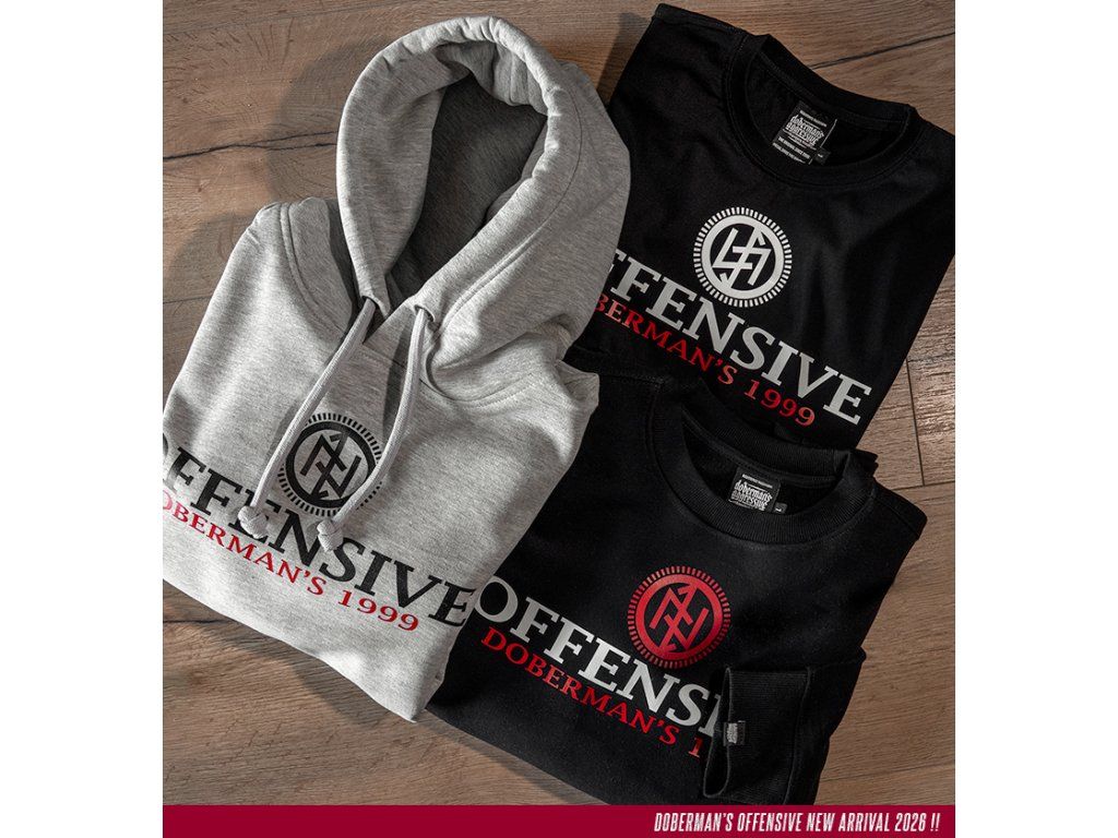 Model s kulatým výstřihem zakončeným žebrovaným lemem a dlouhými rukávy, který zajišťuje pohodlí v chladnějších dnech. Na přední straně se nachází výrazný potisk s velkým nápisem „OFFENSIVE“, doplněný sloganem „Doberman’s 1999“ a charakteristickým symbolem značky umístěným nad typografií. Zadní strana zůstává hladká, což podtrhuje minimalistický charakter střihu a zvýrazňuje výrazný sportovně-streetový akcent na přední straně.