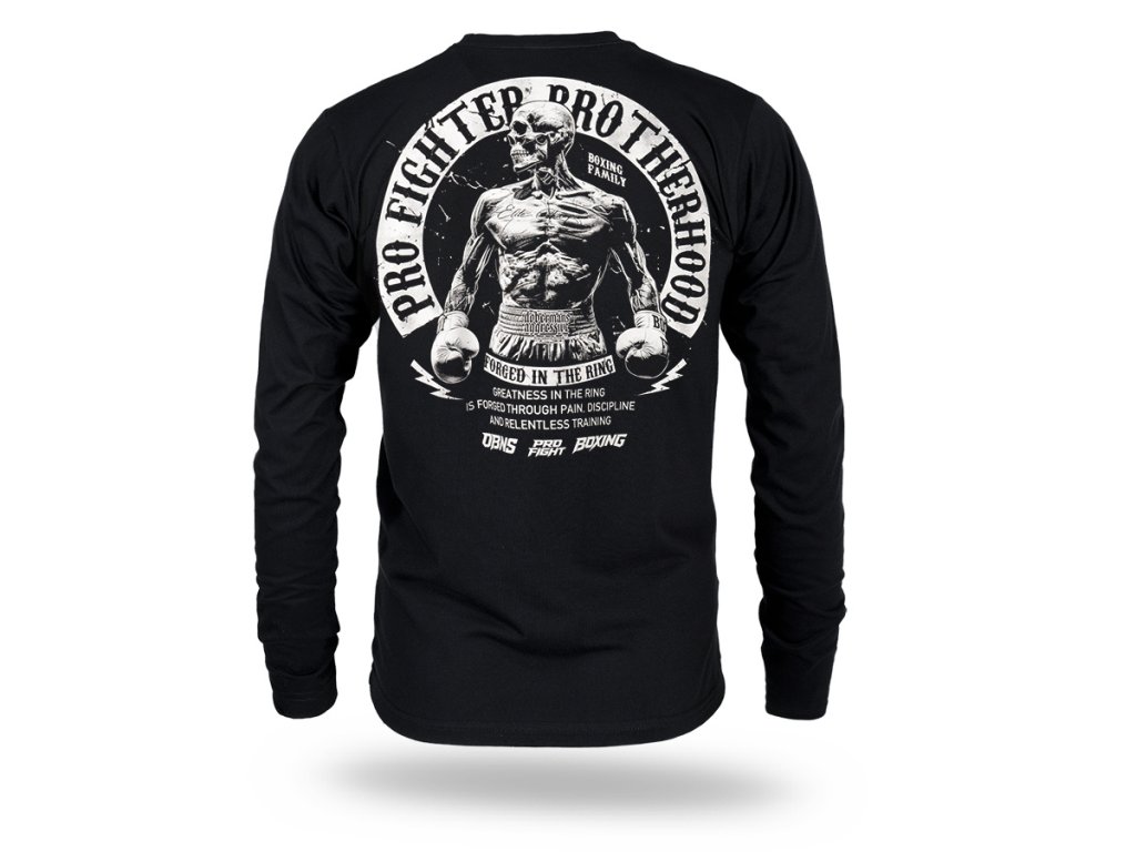 Model je vyroben v pohodlném klasickém střihu s kulatým výstřihem a dlouhými rukávy. Na zadní straně se nachází velký potisk s motivem boxera a nápisem „Pro Fighter Brotherhood – Forged in the Ring“, který odkazuje na sílu, odhodlání a bratrství ve světě bojových sportů. Na hrudi je umístěno menší logo ve stejném stylu. Tričko je navrženo pro každodenní nošení a kombinuje pohodlí s výrazným stylem inspirovaným boxem. Pečlivě zpracovaný potisk a kvalitní zpracování zdůrazňují charakter a odolnost modelu.