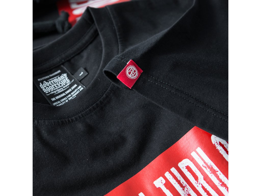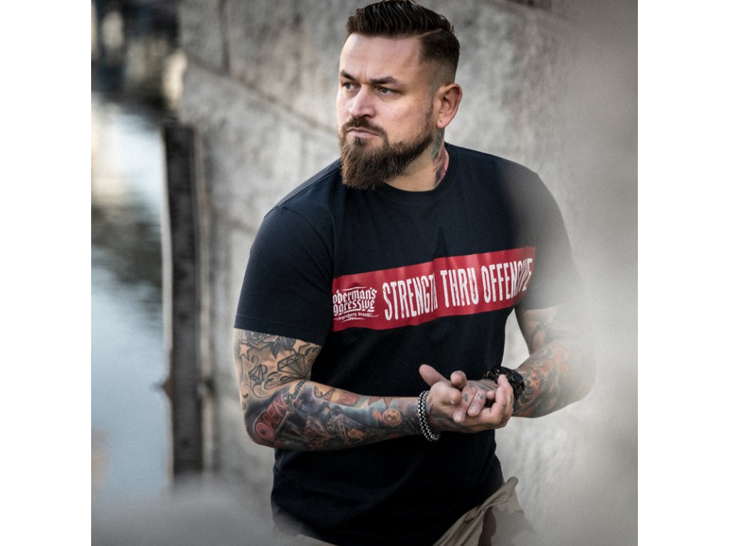 Vzorem na hrudi je červený pruh, který připomíná šerpu nebo pásek přes celou šířku hrudi a na něm je bílé logo Dobermans a heslo vytvořené "zničeným" písmem „Strength thru Offensive”. Dalším zajímavým prvkem, který obohacuje tričko, je malá červená cedulka na rukávu, která barevně navazuje na vzor. Další model z řady Offensive.