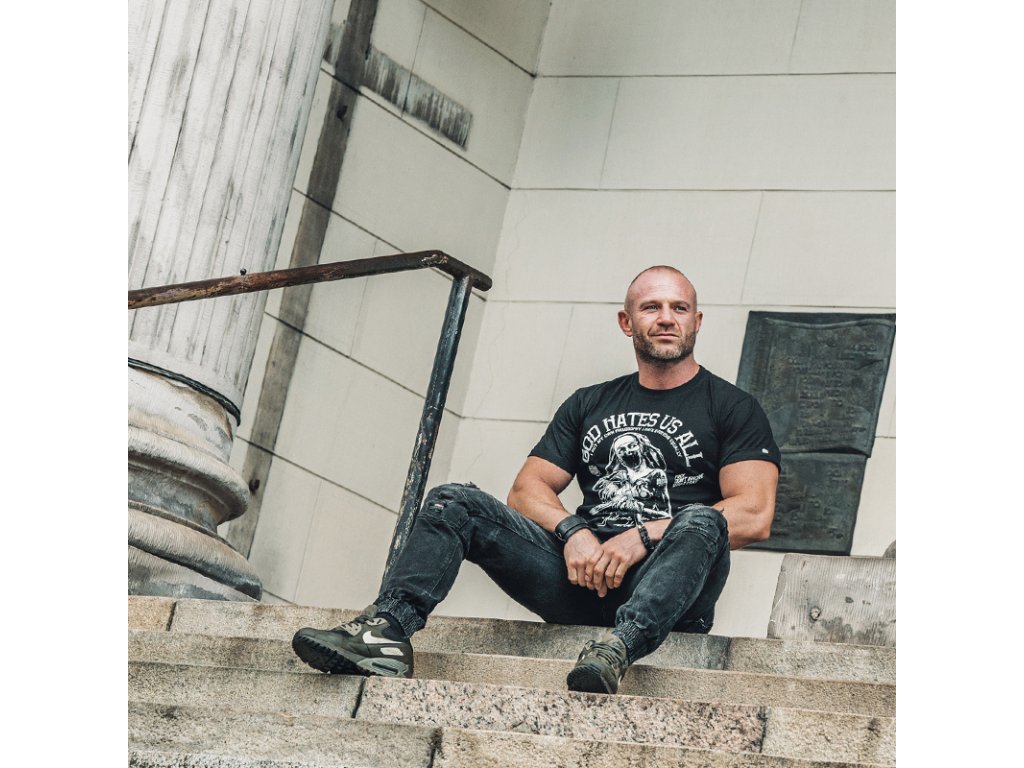Vyrobeno z vysoce kvalitní bavlny. Na levém rukávu je našitá malá cedulka s logem značky. Model The Nun je vytvořený pro vyvolené. Tričko s velkým potiskem postavy jeptišky se zbraní a nápisem GOD HATES US ALL a s logem značky Doberman’s Aggressive.