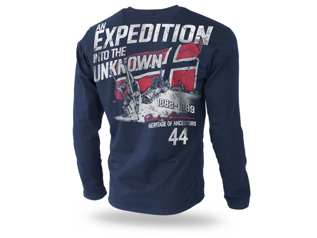 U krku zakončený nevelkým stahovacím lemem, který zlepšuje pohodlí. V dolní části levého rukávu je malá cedulka s logem Dobermans Aggressive. Zadní část trička je z většiny pokrytá potiskem. Vzor s vytrvalými cestovateli, kteří se brodí sněhem, za nimi je velká vlajka v červené barvě. Vzor navazuje na historické události a zapadá do stylu řady Expedition. Na levé straně hrudi je malá norská vlajka.