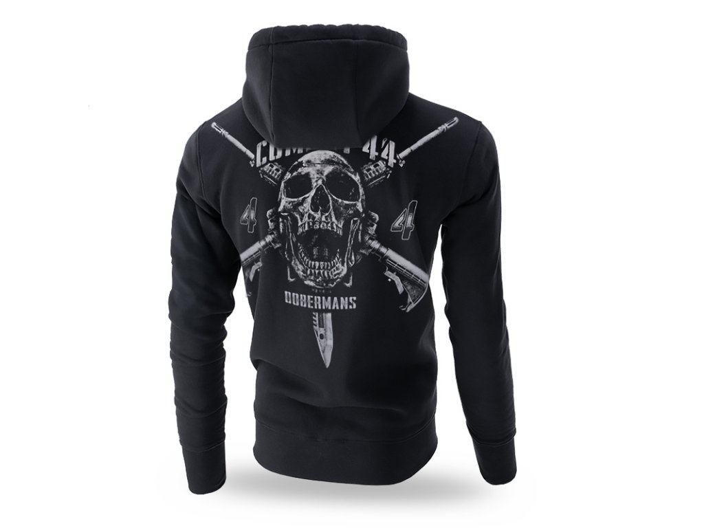 Vzor s motivy, které jsou typické pro kolekci Combat 44: uprostřed vzoru velká lebka, za ní dvě zkřížené pušky, výše název série, níže logo Dobermans. Na krku nevelký potisk v podobě razítka, opakuje se na přední straně klokanky. Mikina oblékaná přes hlavu, vyrobená z vysoce kvalitní bavlněné látky o hmotnosti 320g. Má odolné stahovací lemy a praktickou našitou kapsu. U kapuce jsou šňůrky a kovová zakončení označená znakem značky.