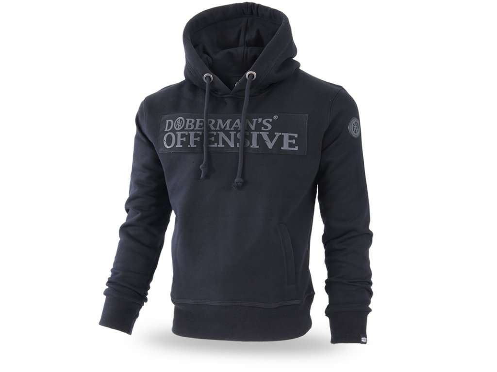 Materiál, ze kterého je oblečení vyrobeno, je 100% bavlna o hmotnosti 300g. Objemná kapuce dobře zakrývá hlavu, dá se nastavit pomocí šňůrek. U kapuce jsou kovová zakončení s logem Dobermans. Uvnitř mikiny je všitá velká firemní etiketa, a na levém rukávu je malá cedulka s logem značky. Velká, objemná kapsa typu klokanka na přední straně mikiny. Na kapse je našitá velká bavlněná látka s potiskem Dobermans Offensive. Potisk je vytvoření 3D technologií. U dolního stahovacího lemu je všitá cedulka s logem vojenské řady. Bavlněná mikina s kapucí. Velká, objemná kapsa typu klokanka na přední straně mikiny.