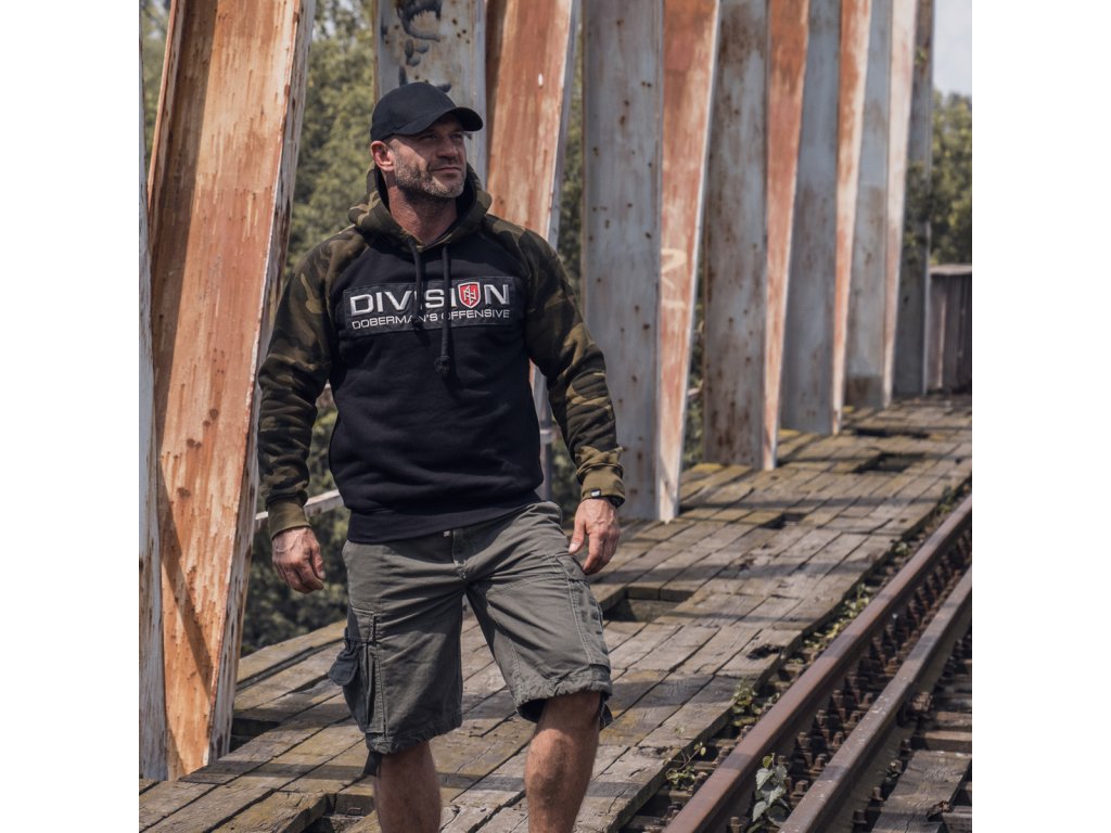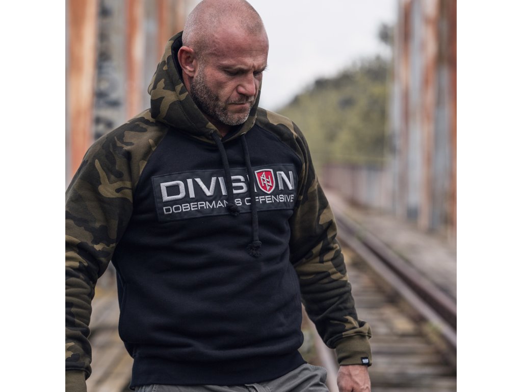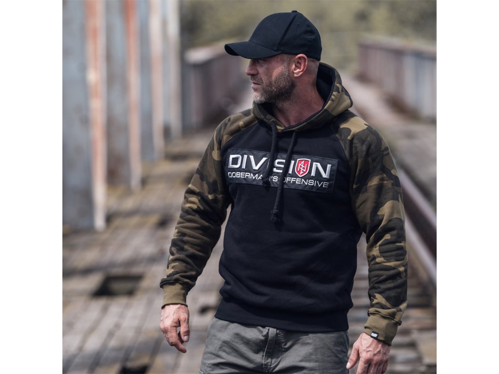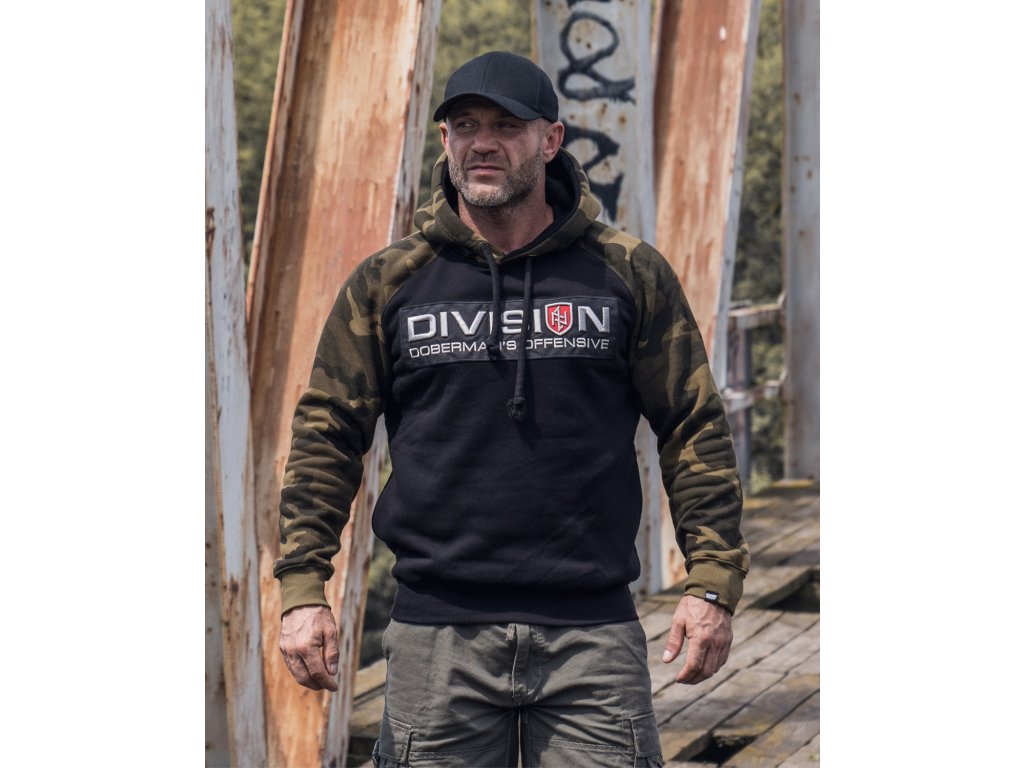 Dolní část mikiny a rukávy jsou zakončené širokým stahovacím lemem. Mikina se střihem typu raglan. Vyrobená v kombinaci dvou barev: černá a maskáčová. Na přední straně mikiny se nachází velká nášivka s 3D výšivkou „DIVISION DOBERMAN’S OFFENSIVE”.