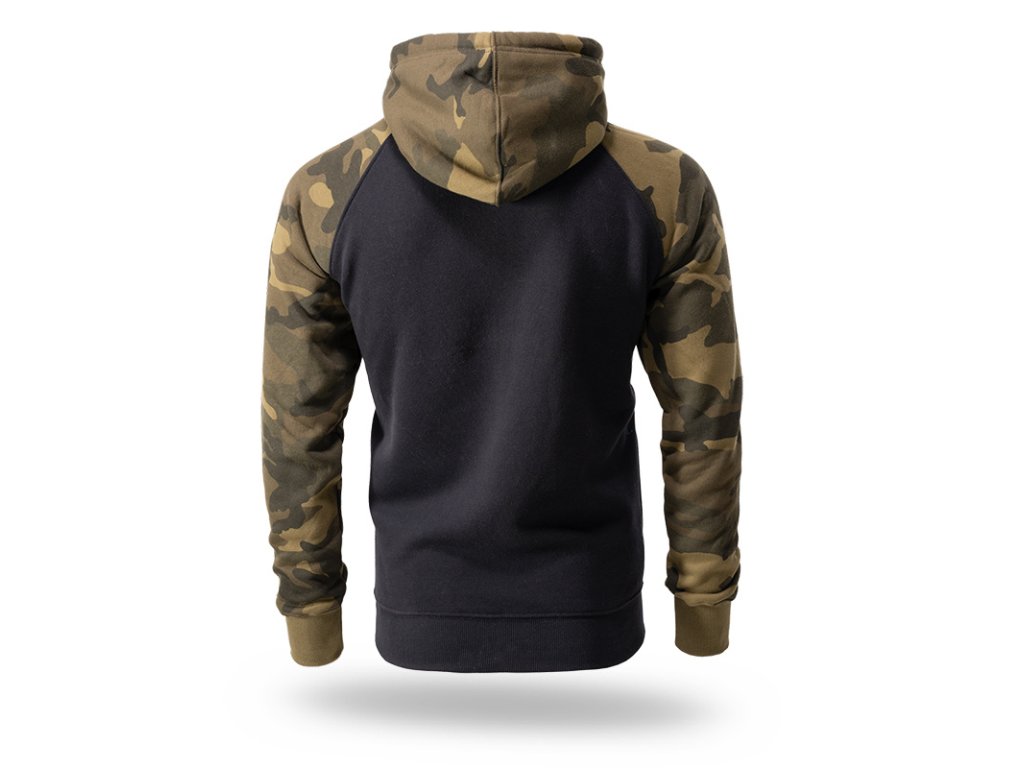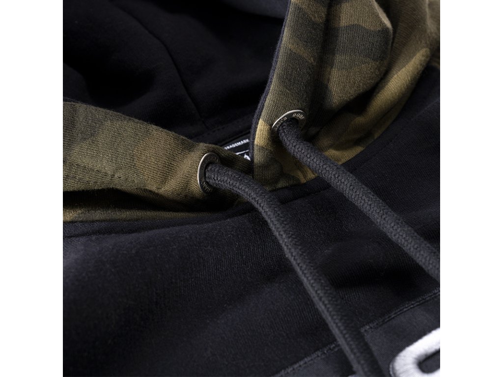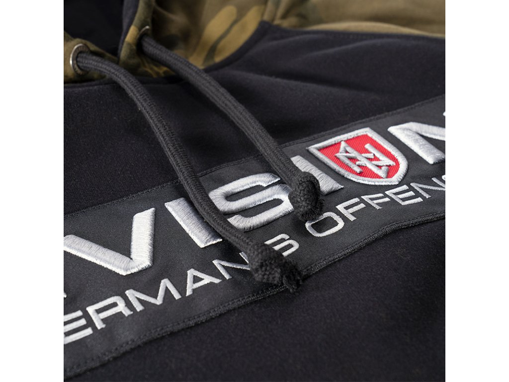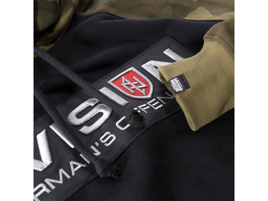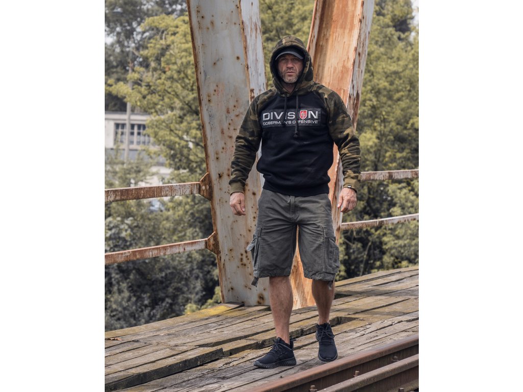 Dolní část mikiny a rukávy jsou zakončené širokým stahovacím lemem. Mikina se střihem typu raglan. Vyrobená v kombinaci dvou barev: černá a maskáčová. Na přední straně mikiny se nachází velká nášivka s 3D výšivkou „DIVISION DOBERMAN’S OFFENSIVE”.