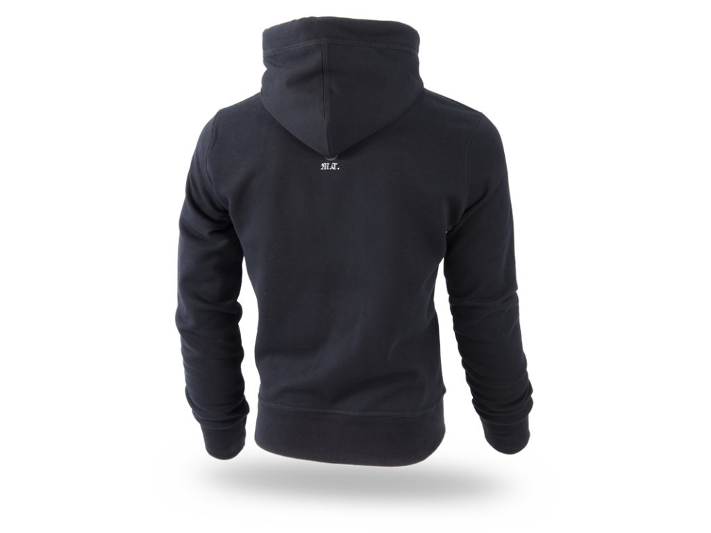 Uprostřed vzor postava motorkáře, výše nápis Welcome To Hell, níže prapor s maltézským křížem a heslo Death Rider. Na krku kulatý štít s runovým znakem značky Doberman's Aggressive a iniciály M.D. Použité písmo v gotickém stylu a efekt popraskání potisku. Mikina se složením 100% bavlny. Model s praktickou kapucí a odolnými stahovacími lemy. U kapuce jsou šňůrky a kovová zakončení.