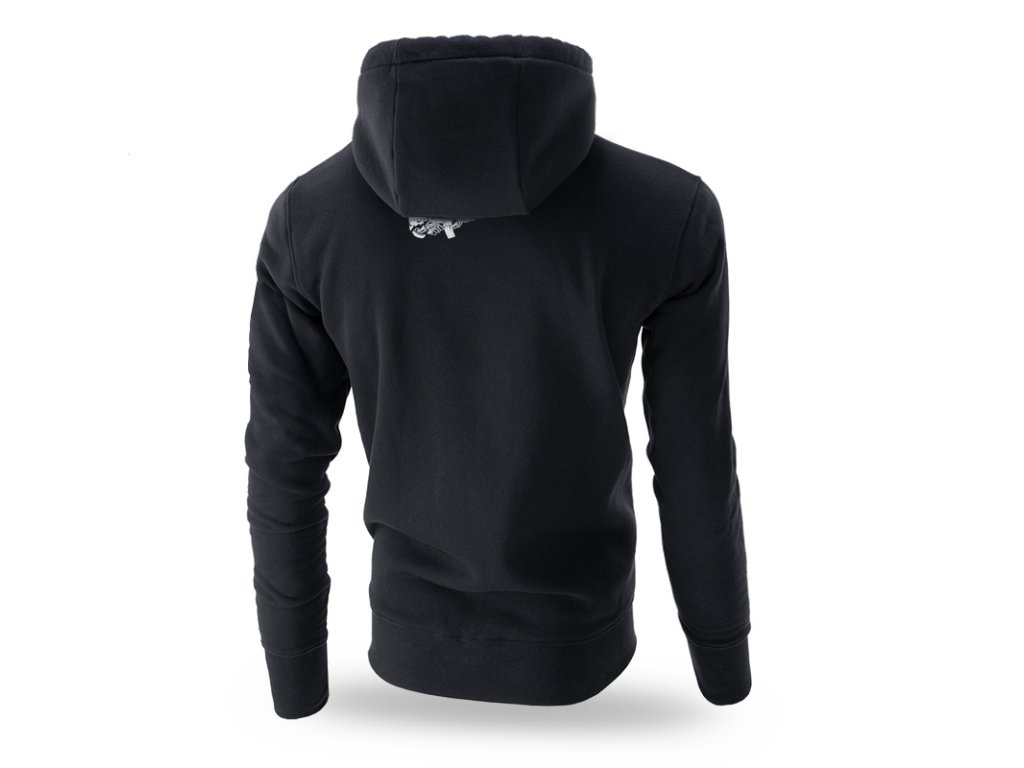 Klokanka z vysoce kvalitní bavlny, zakončená pevnými šňůrkami u krku, s kovovými zakončeními Doberman’s a všitou kapsou na břichu.