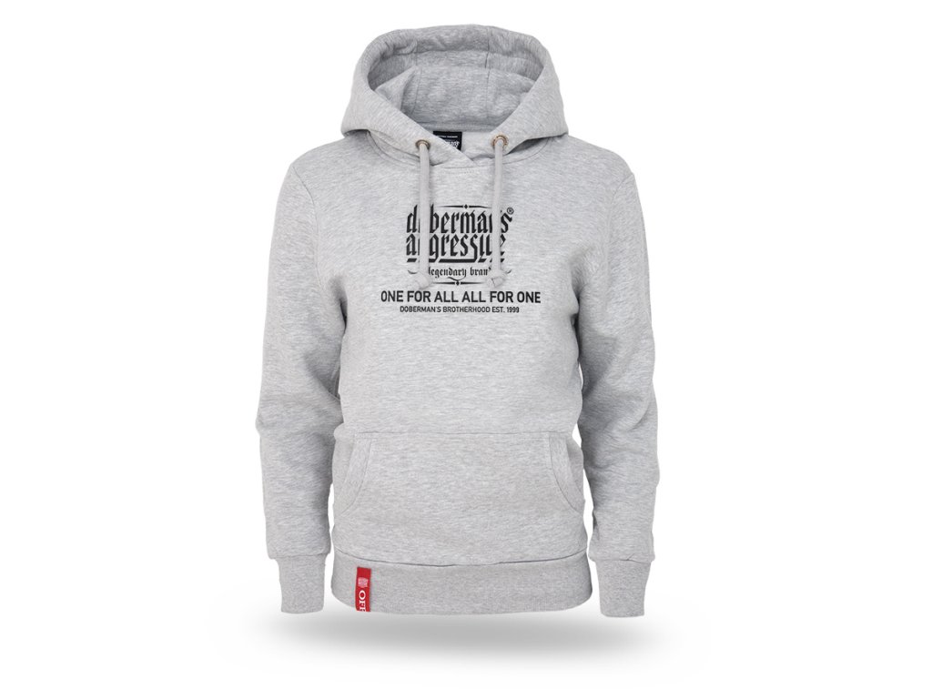 Model vybavený nastavitelnou kapucí se šňůrkami a velkou klokankovou kapsou na přední straně. Spodní lem a manžety jsou zakončeny elastickým úpletem pro lepší přizpůsobení a pohodlí při nošení. Na přední straně se nachází výrazný potisk s logotypem „Doberman’s Aggressive – legendary brand“ a sloganem „One for all, all for one – Doberman’s Brotherhood est. 1999“, zdůrazňujícím identitu a charakter značky. Jednoduchý a funkční střih spojuje pohodlí s výrazným, snadno rozpoznatelným sdělením.