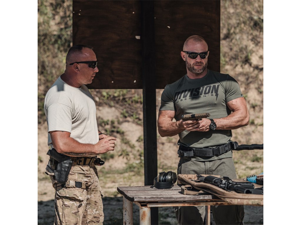Dolní část mikiny a rukávy jsou zakončené širokým stahovacím lemem. Na levém rukávu je umístěná malá cedulka s logem značky. Na přední straně mikiny se nachází nápis DIVISION napsaný tučným písmem, navíc do písmene N byl začleněn symbol blesku, který všemu dodává jedinečný charakter. V dolní části je nápis DOBERMANS. Celek vzoru je vytvořený metodou vypouklého potisku, díky tomu je tento model ještě více jedinečný.