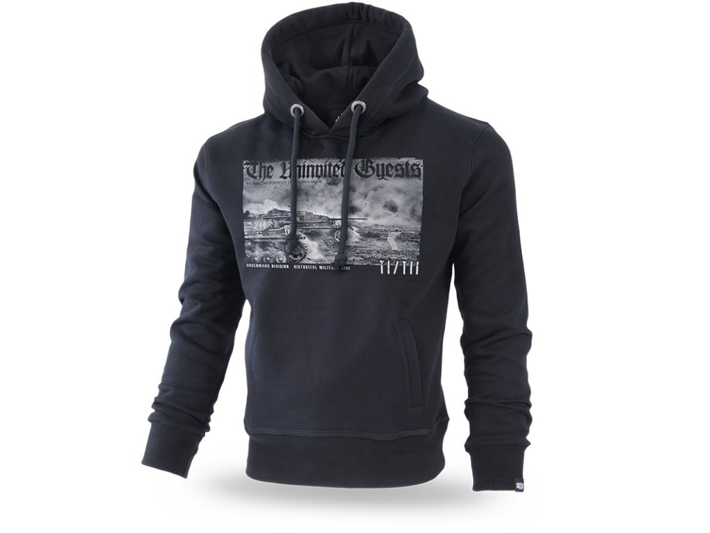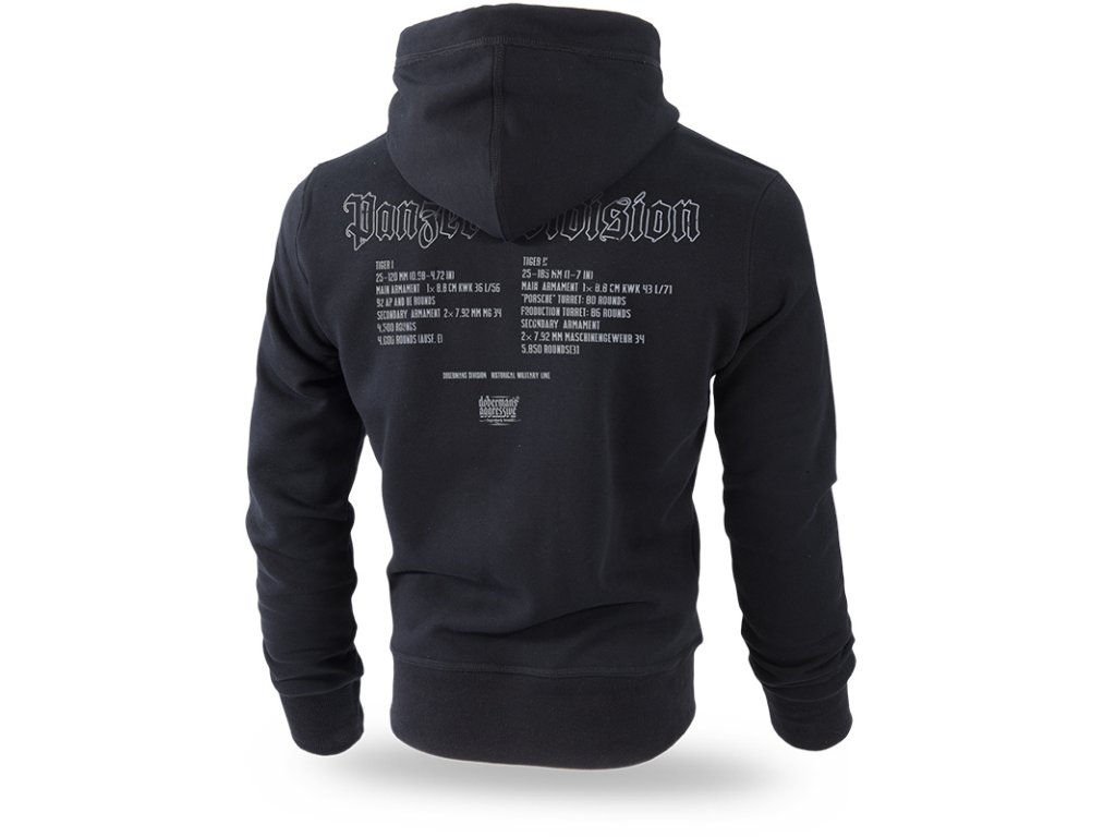 K nastavení kapuce slouží hrubé šňůrky s kovovým zakončením. Spodní část a rukávy mikiny jsou zakončené stahovacími lemy. Materiál je vysoce kvalitní bavlna s hmotností 320g. Na přední straně nad kapsou je potisk se třemi tanky na bitevním poli. Na zádech je vytištěná bojová specifikace strojů a nápis Panzer Division. Potisky jsou jednobarevné s efektem popraskání. Vzor z historické kolekce.