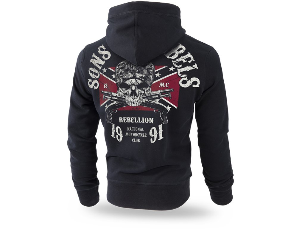 Velká kapuce zakončená hrubými šňůrkami k nastavení. Mikina je vyrobená z vysoce kvalitní bavlny o hmotnosti 320g. Spodní část a rukávy jsou zakončené širokými stahovacími lemy. Na levé straně potisk s číslem 13 a nápisy. Na zádech je velký, dvoubarevný vzor s lebkou, na pozadí konfederační vlajky. V pozadí dvě brokovnice. Celek je uzavřen nápisem Sons of Rebels v horní části vzoru.