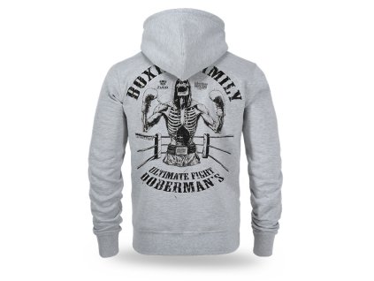 Klasická sportovní mikina s nastavitelnou kapucí a kapsou typu klokan. Na přední straně je malé logo 'Boxing Family', zatímco na zadní straně je velký, výrazný potisk kostlivce boxera v ringu, obklopeného nápisy 'Boxing Family', 'Ultimate Fight' a 'Doberman’s'. Žebrované manžety a spodní lem zajišťují dobré přizpůsobení.