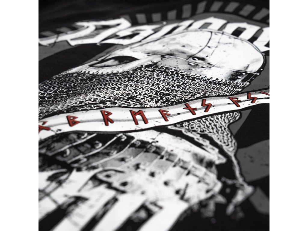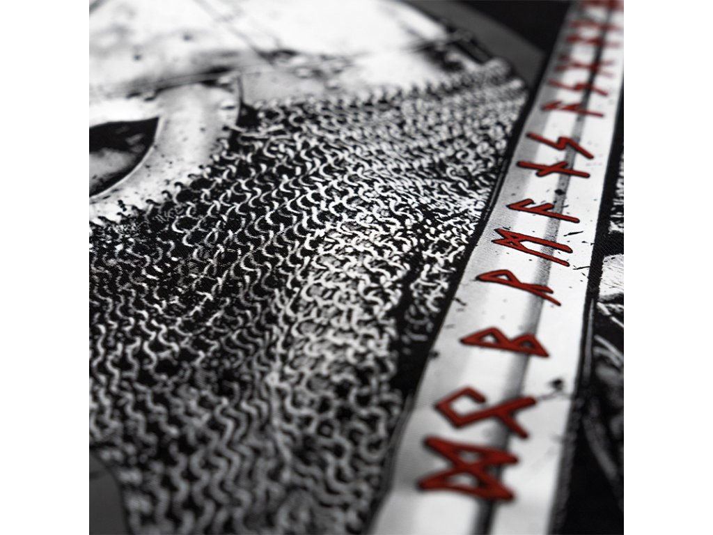 Na levém rukávu je malá cedulka s logem značky. Kapuce je ozdobená pevnou šňůrkou a kovovými zakončeními s logem značky. Na zádech je vzor, který zobrazuje Vikinga, který drží meč ozdobený severskými prvky. Na přední straně na levé straně hrudi se nachází nápis Asgaard’s mighty walls.